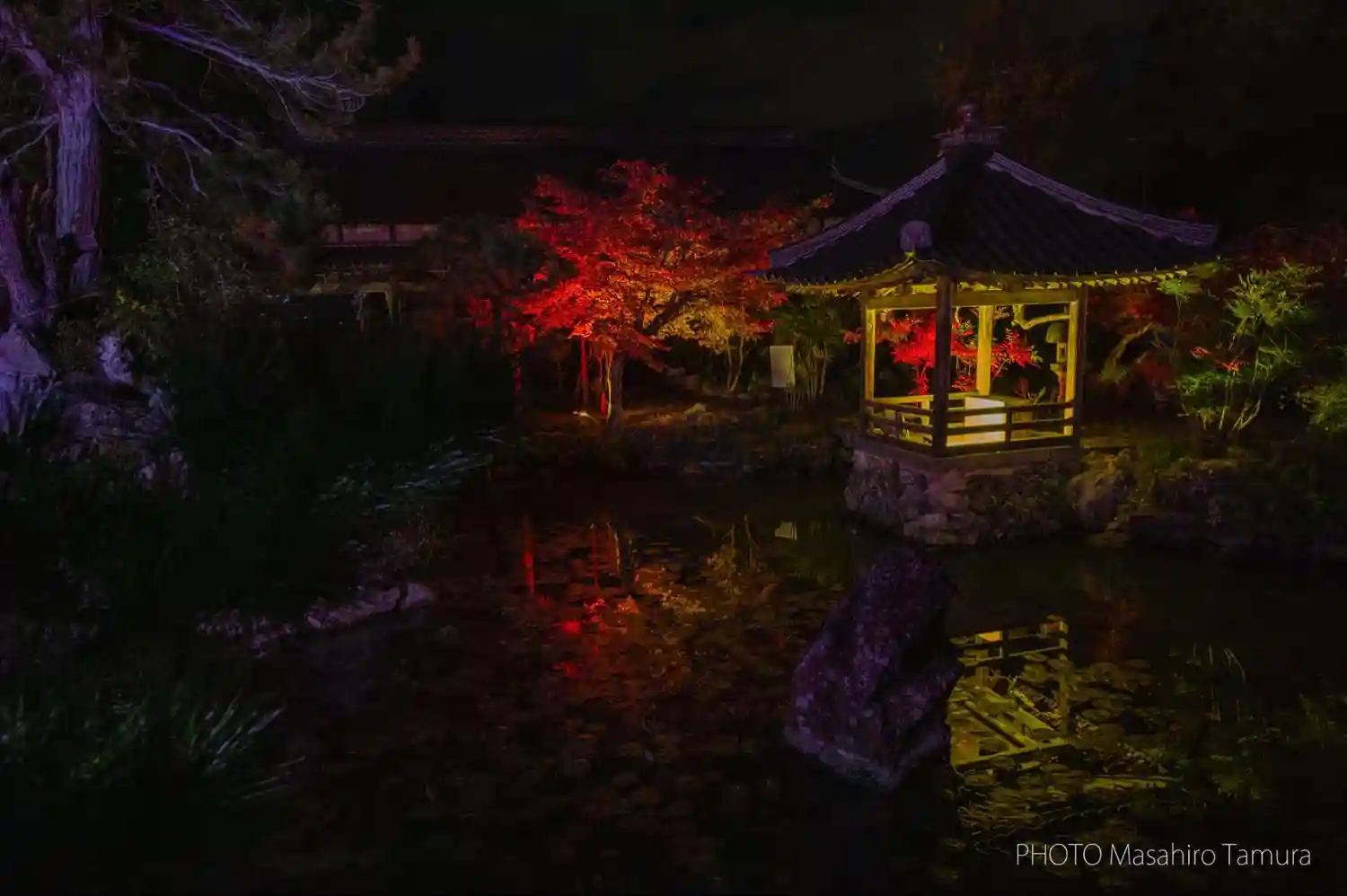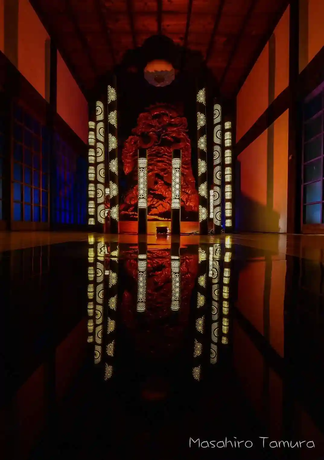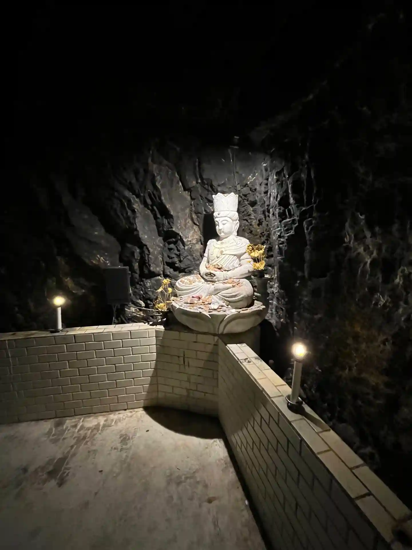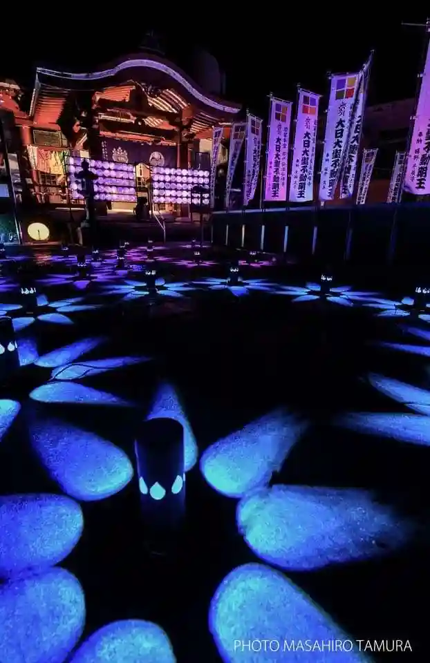 岩窟本堂内は常に暗いため、ライトアップがいっそう映えます。