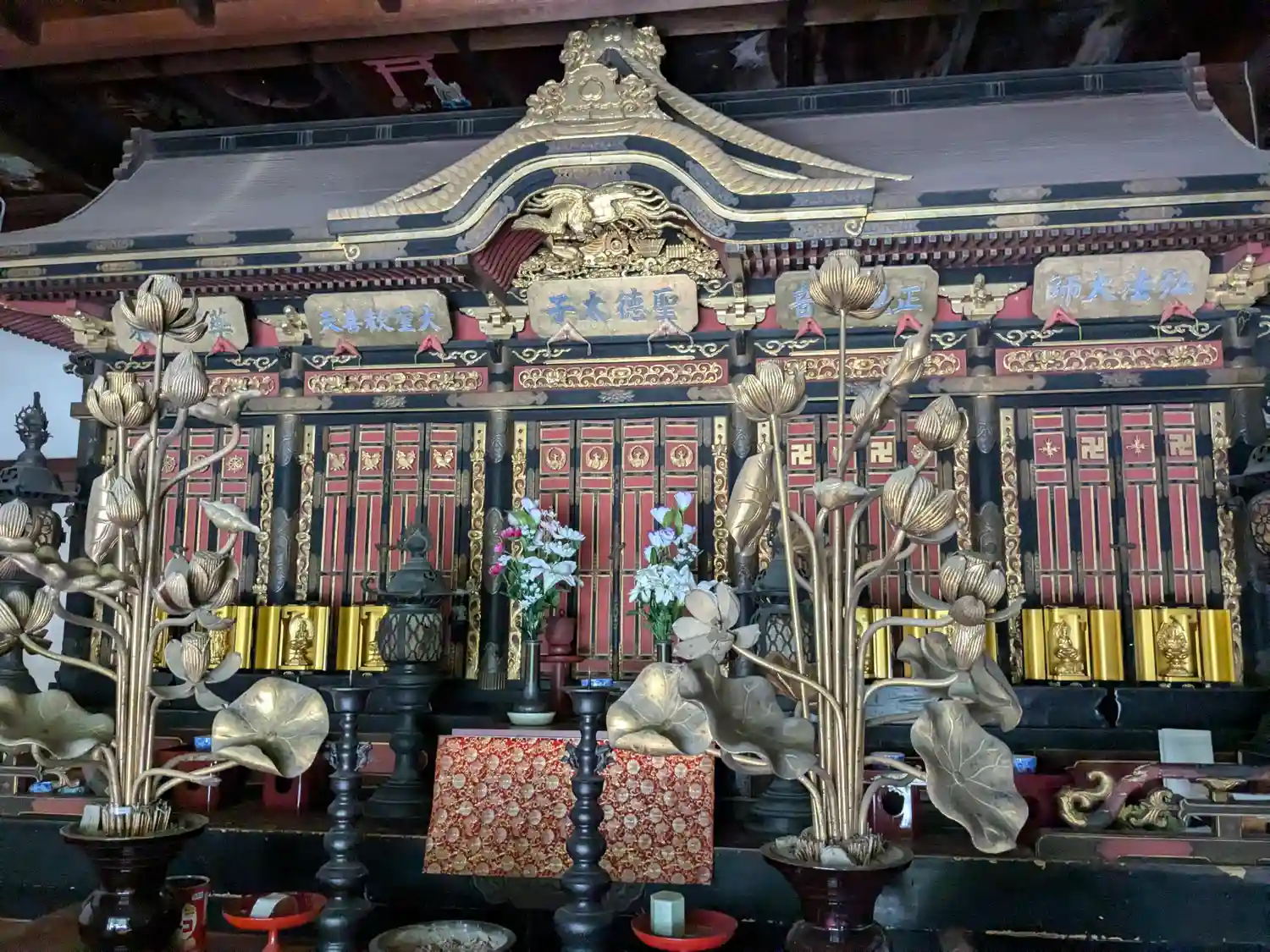 左から薬師如来、大聖歓喜天、聖徳太子、聖観音?、弘法大師の厨子(全て閉扉)