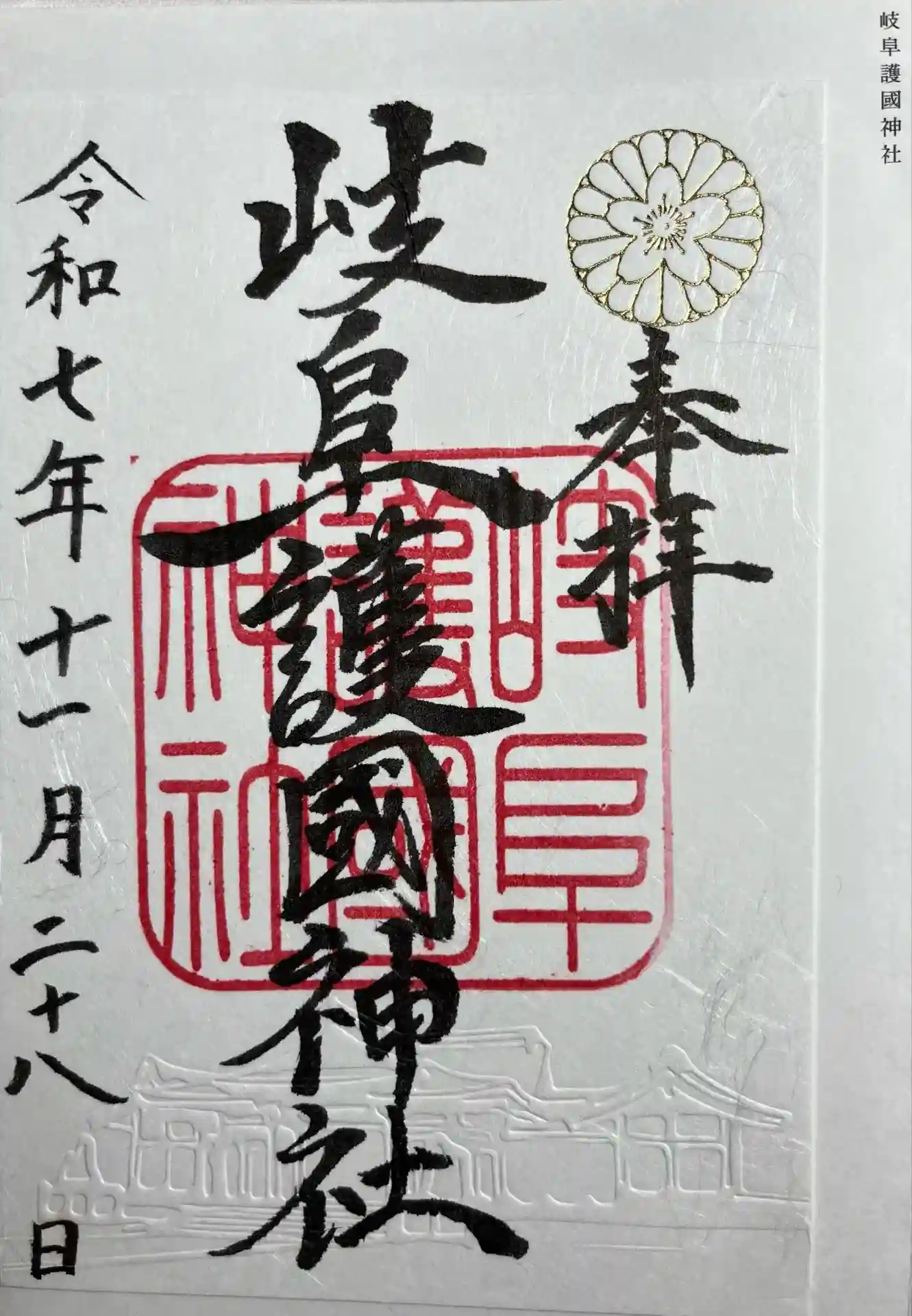 | 御朱印帳に直書き | あり 当社の御朱印帳には「岐阜護國神社」と境内末社「足乳根宮」(たらちねぐう)・「河童大明神」(かっぱだいみょうじん)の御朱印が直書きしてあります。 |