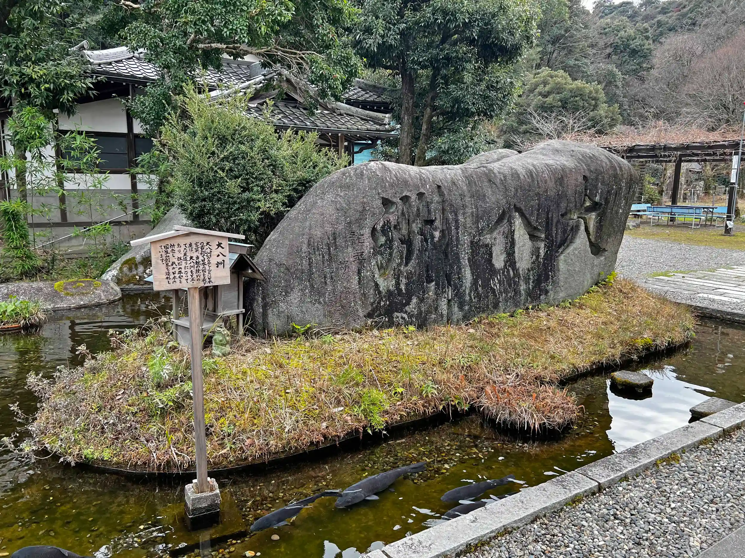 参道左側の<大八洲(おおやしま)>。日本の古称で日本の国土を表す。当社境内の庭園は大八洲を見たてて造られている。