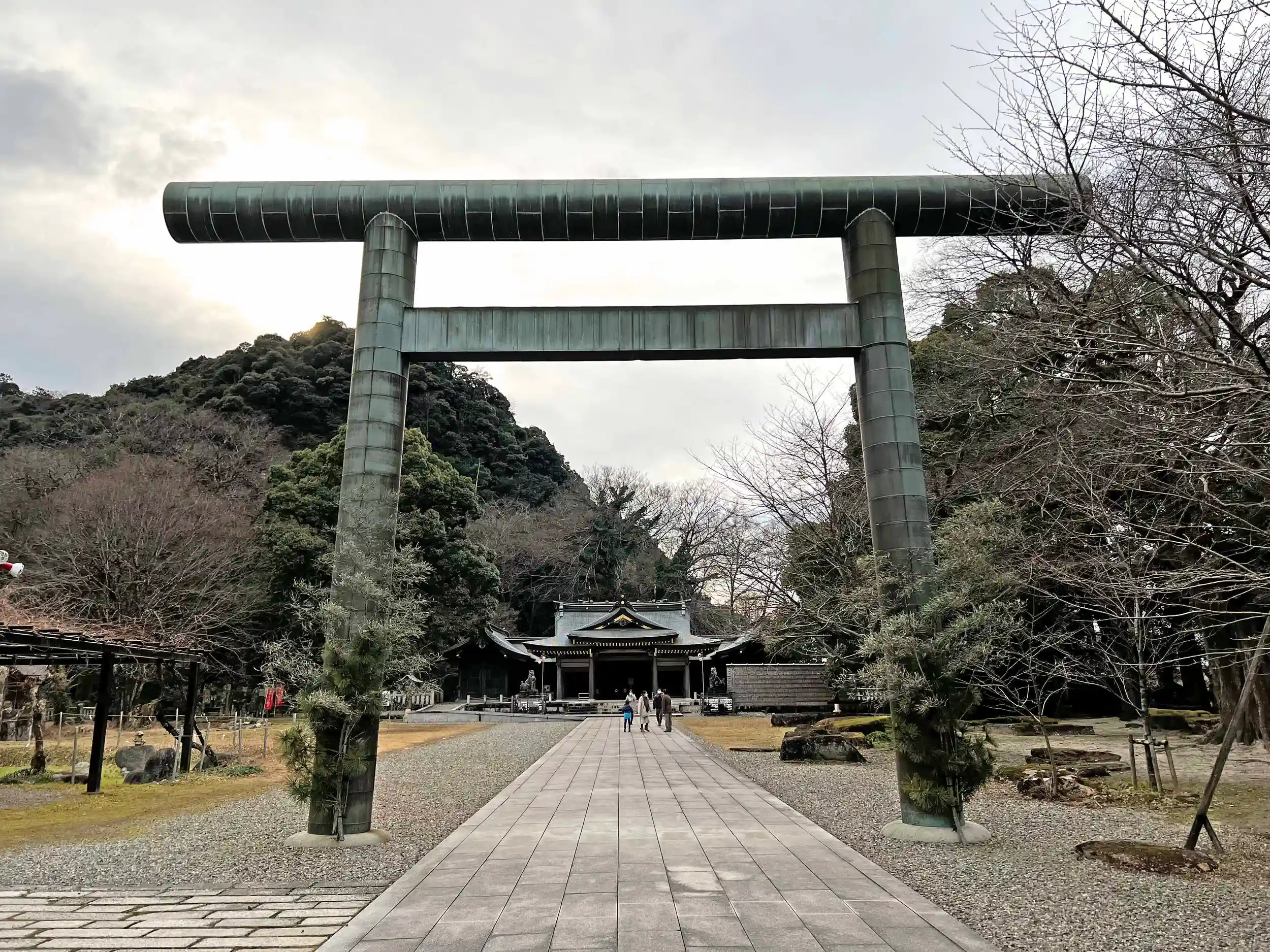 境内北東部入口にある、青銅製の<一の鳥居>。遠くの社殿まで参道がまっすぐ伸びる。厳かな空気感。