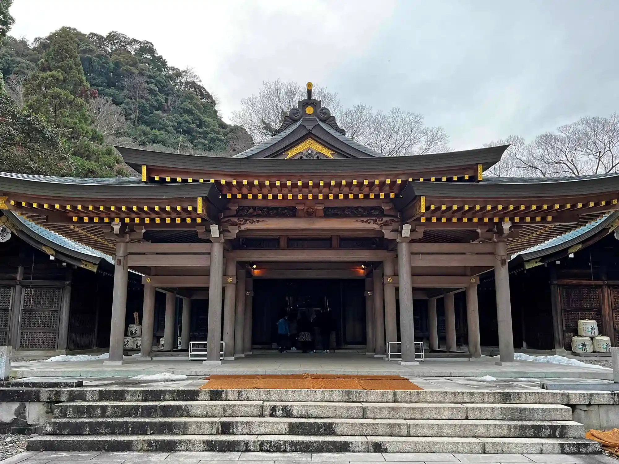 <拝殿>全景。威風堂々。左右に翼殿を備える。1995年に終戦50周年で再建。