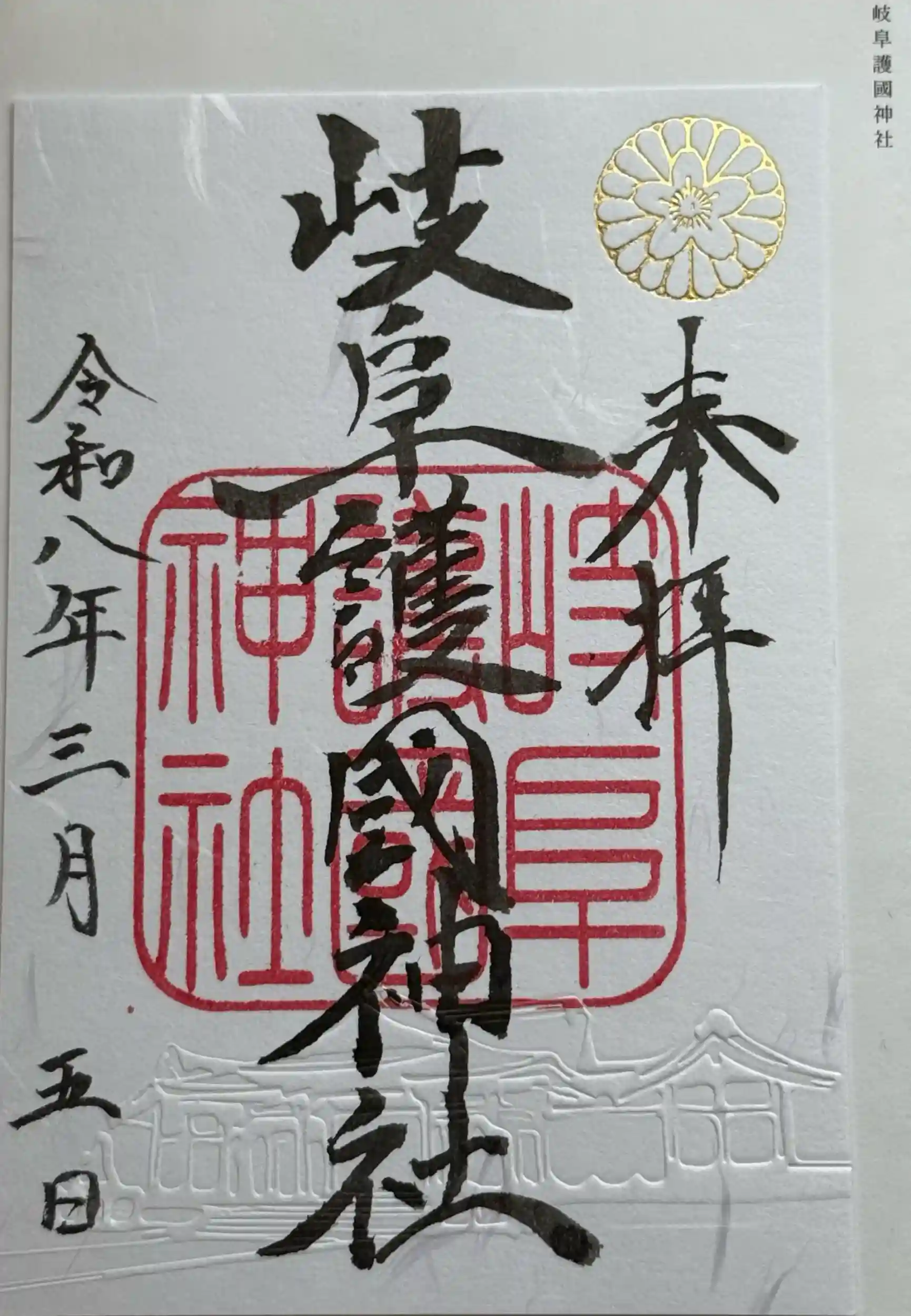 ひらひらさん投稿で、岐阜護國神社の御朱印帳には最初からこちらで頂ける3個の直書き御朱印が書かれていて、購入すると日付だけ書き込んで頂いたそうです。