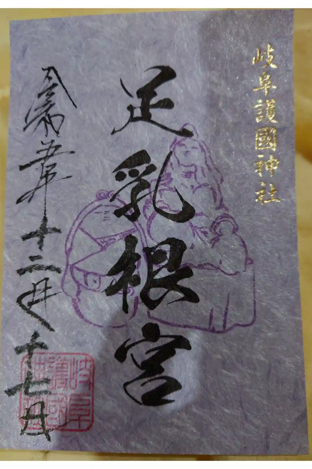 足乳根宮さんの御朱印。御朱印帳をいただいたところ、すでに岐阜護國神社・足乳根宮・河童大明神の三体が御記帳済みで、その場にて日付を入れてくださいました(通常は書置きのみ)。