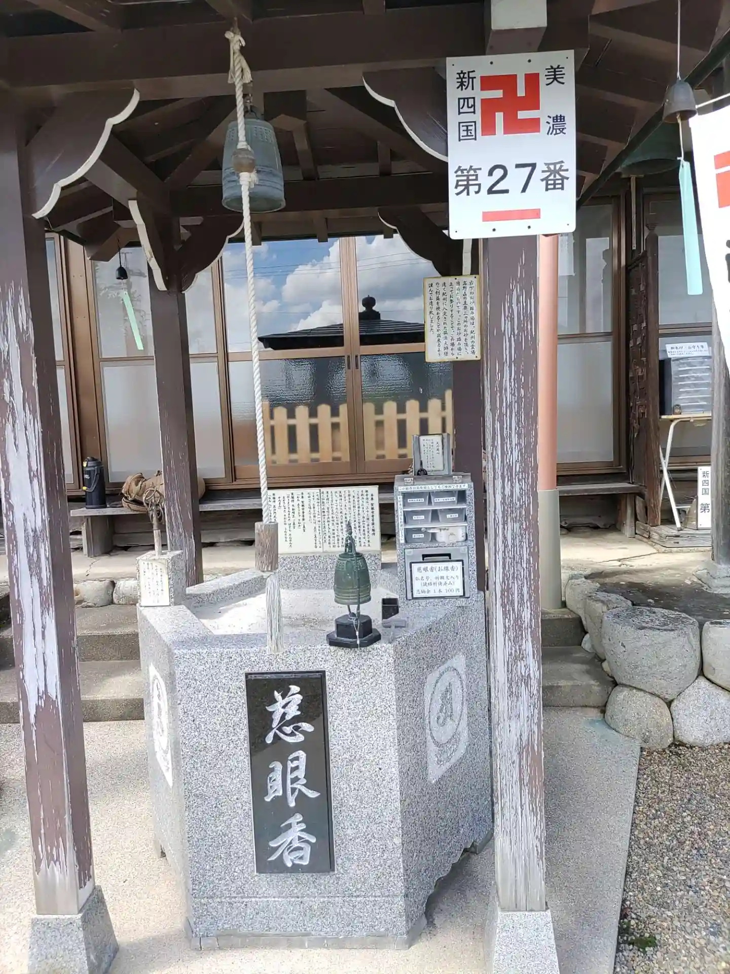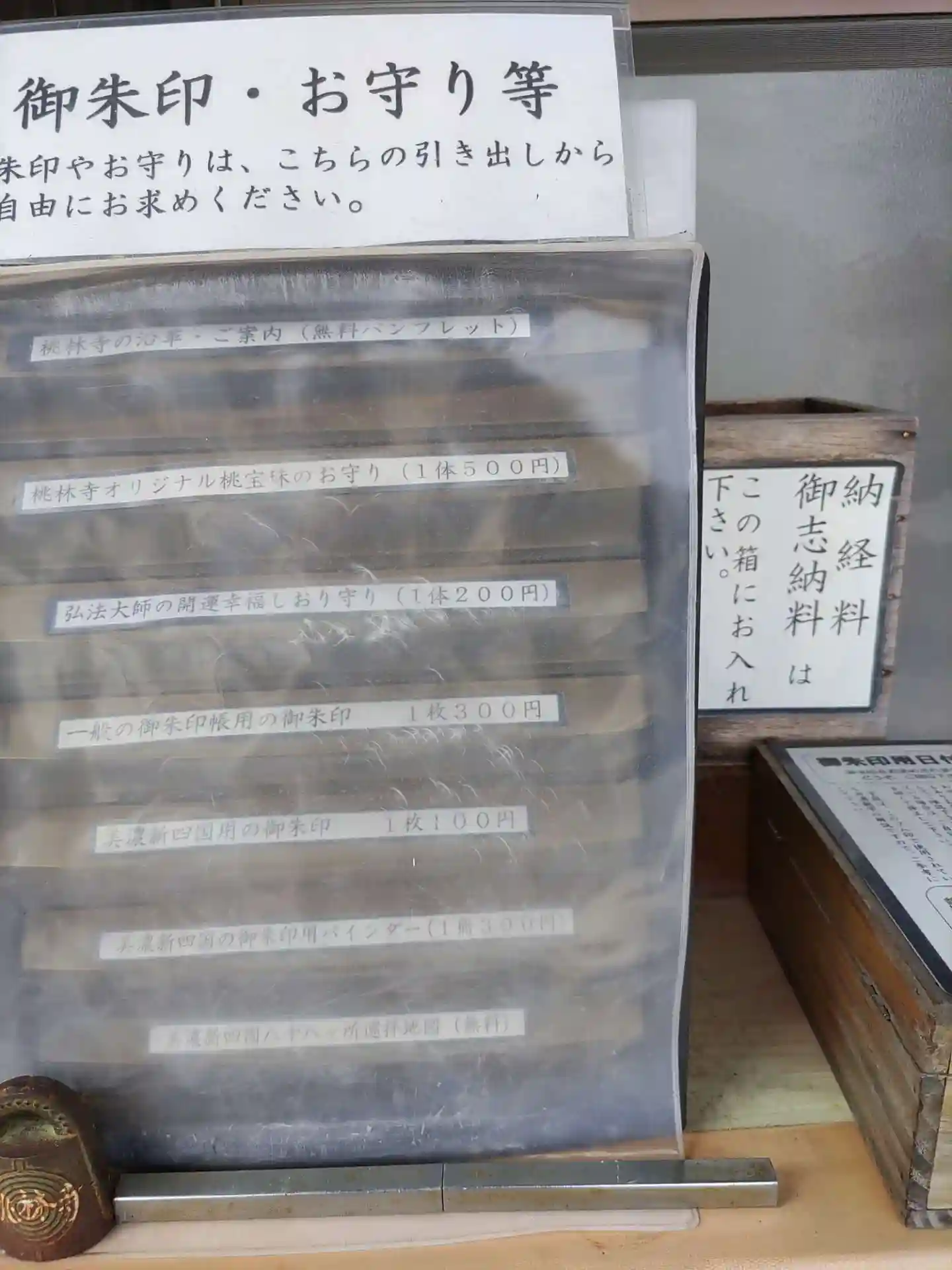 本堂の前に、お守りや書き置きの御朱印などが入ったケースです
