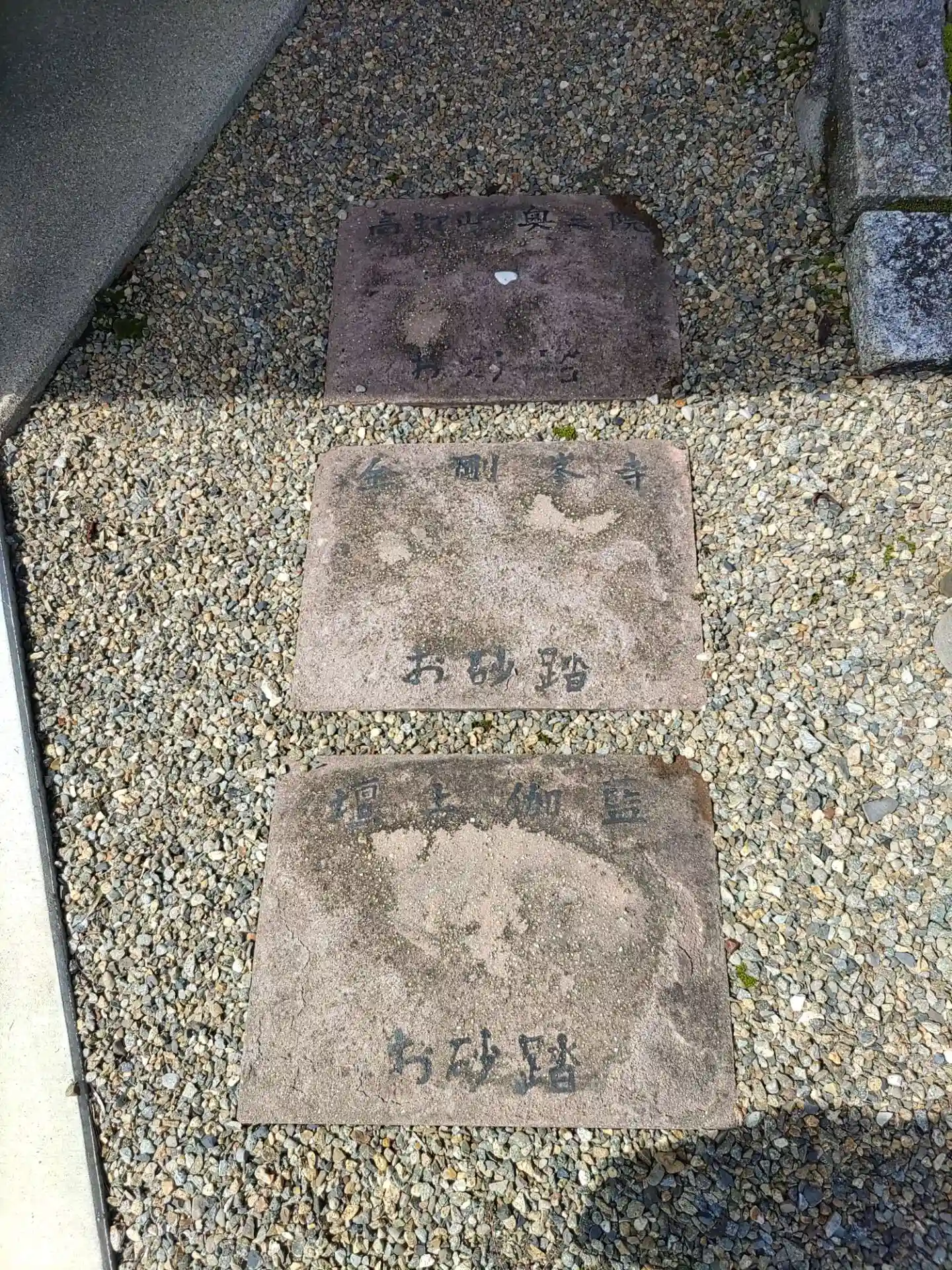 お砂踏み 手前から「壇上伽藍」 「金剛峯寺」 「高野山奥之院」 3ヶ所のお砂を頂き、このお砂踏み場に立って、弘法大師様のご利益を授かることができるように造られたそうです。