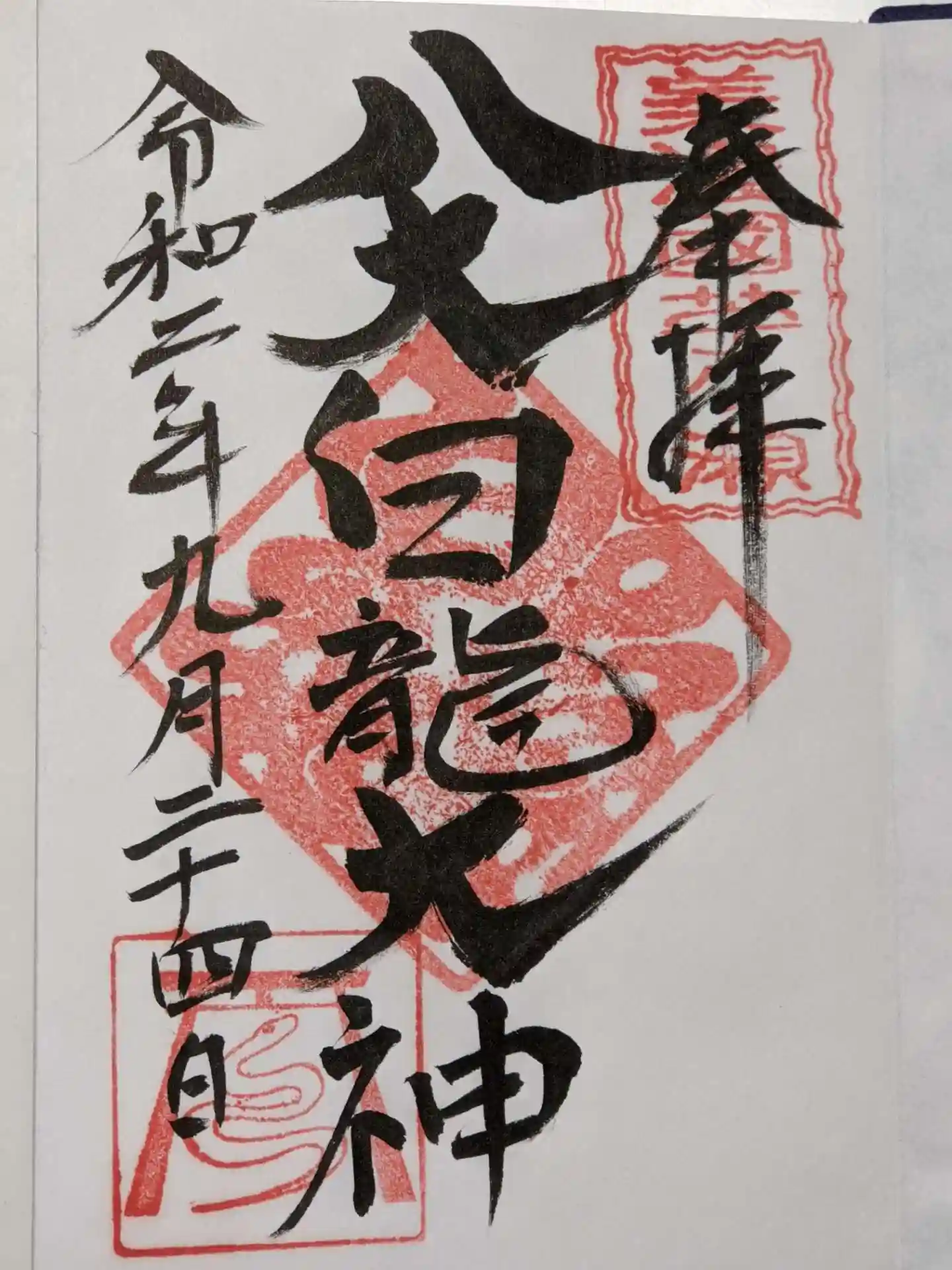 八大白龍大神です。龍王より位は下になります。何でも八大白龍は悪さをしていて、八大龍王に懲らしめられた末、修行を重ねて神様になった龍なのだそうです。