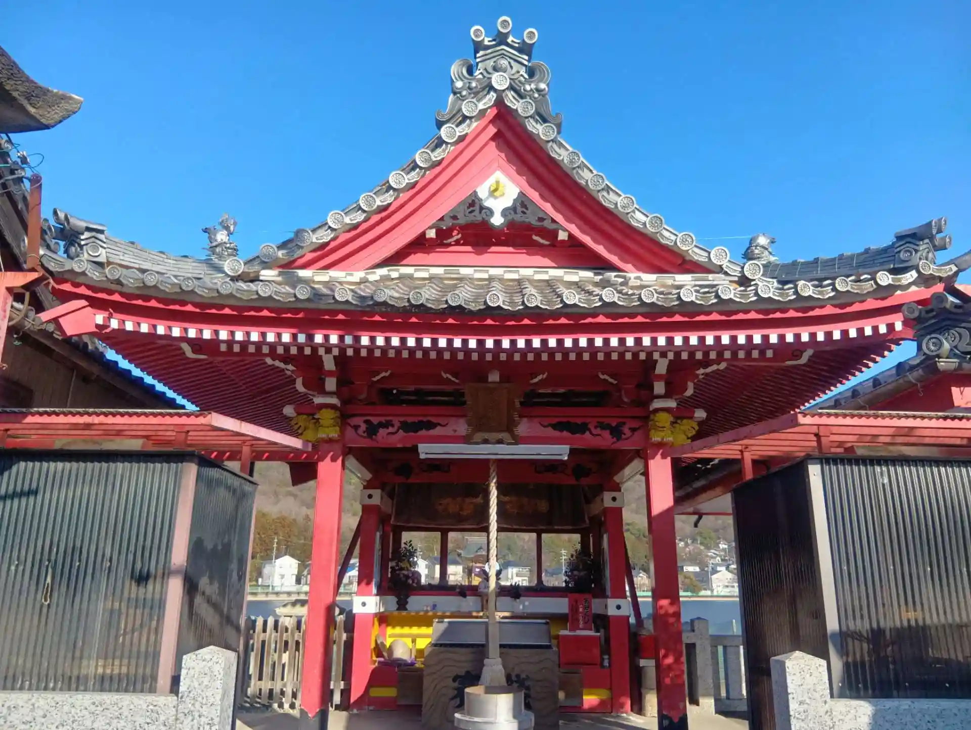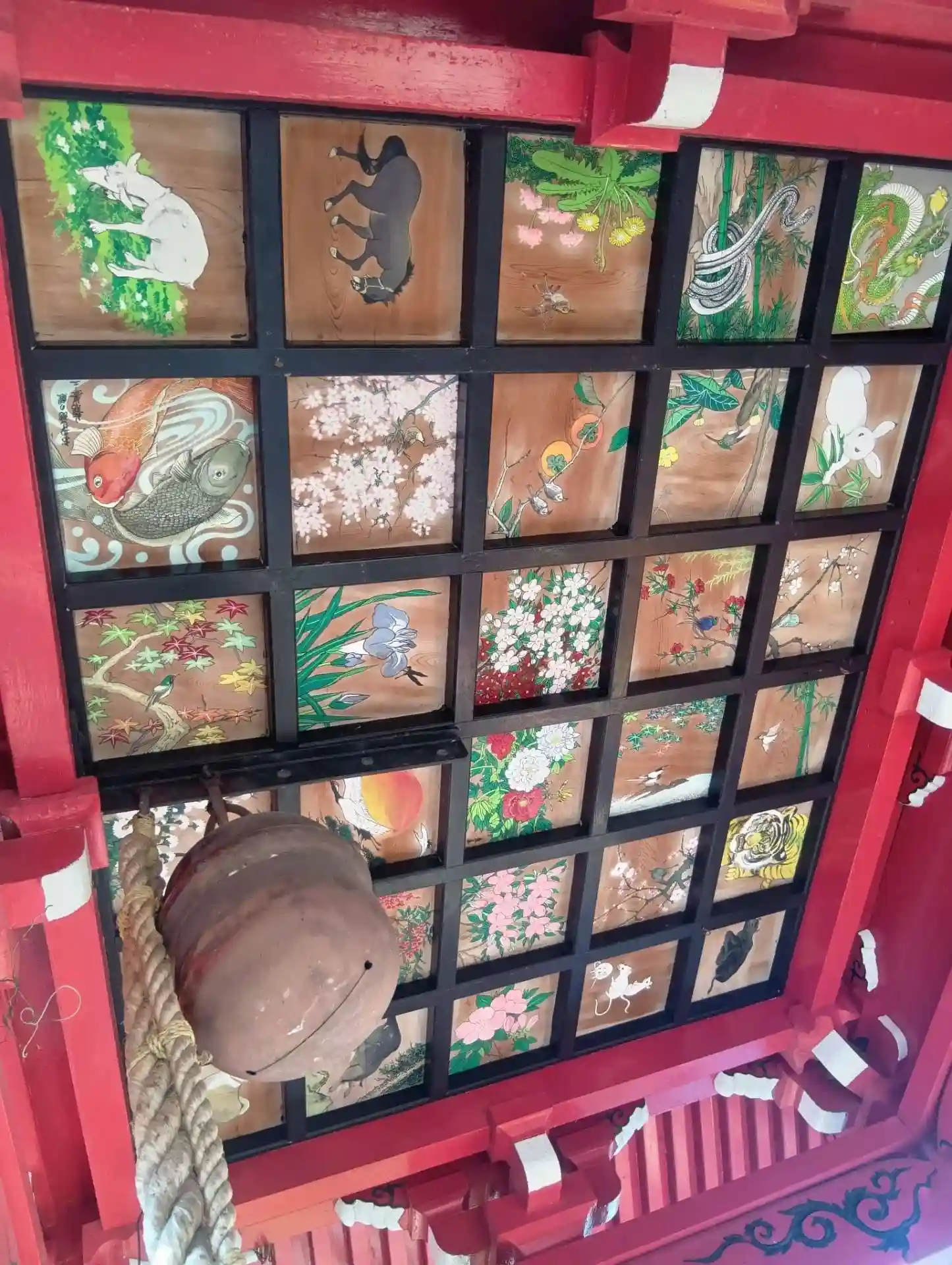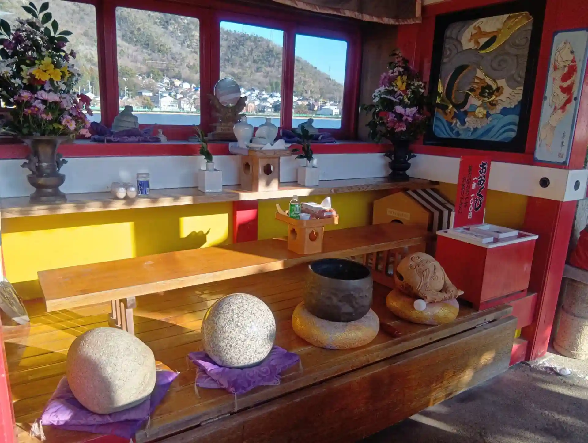 岐阜県各務原市各務おがせ町、苧ヶ瀬池(おがせいけ)の西側にある「八大龍王総本殿」を初参拝させていただきました。赤い拝殿と美しい天井絵が印象的でした。拝殿よりガラス窓越しに、池上に浮かぶお社が拝見できます。拝殿には、白蛇の置物2体、神鏡、おもかる石、木魚、りん(お鈴)が並んでいました。神社・寺院のような感じです。社務所にて、かっぱえびせんやお麩が鯉の餌として売られており、ウッドデッキから池にいる鯉に餌やりをして楽しむ参拝者の方がいらっしゃいました。そこから、池上のお社がよく拝見できました。御朱印はありません。境内すぐそばに駐車場があります。