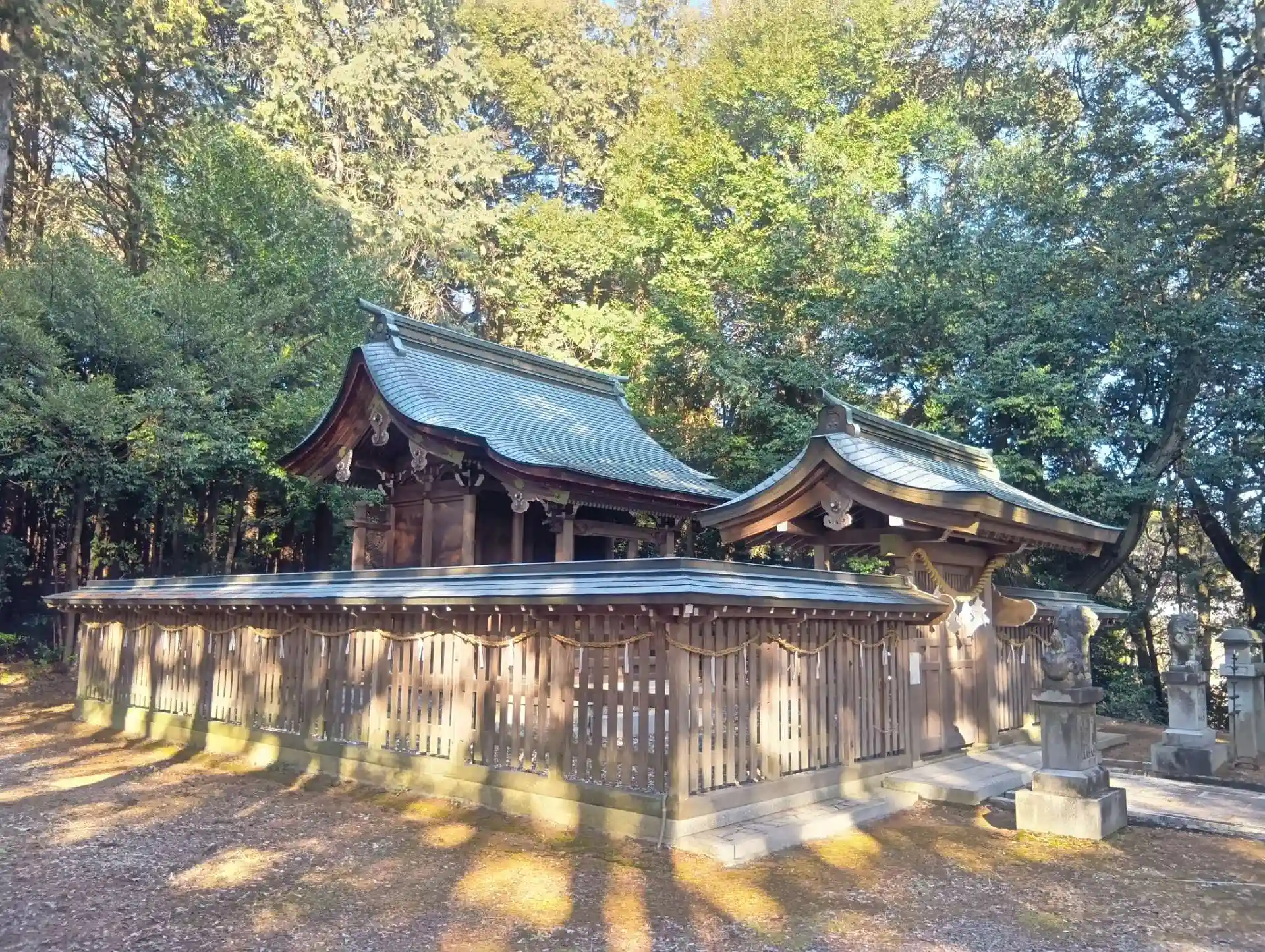 拝殿の北側裏に、奥の院本殿への階段がありました。階段を登ると奥の院本殿がひっそりと鎮座しておりました。拝殿の西側には舞台村國座があり、その北側には急勾配な階段の先に秋葉神社が鎮座しておりました。境内の東側に広い駐車場があります。境内のまわりは細い道に囲まれているため、注意が必要です。