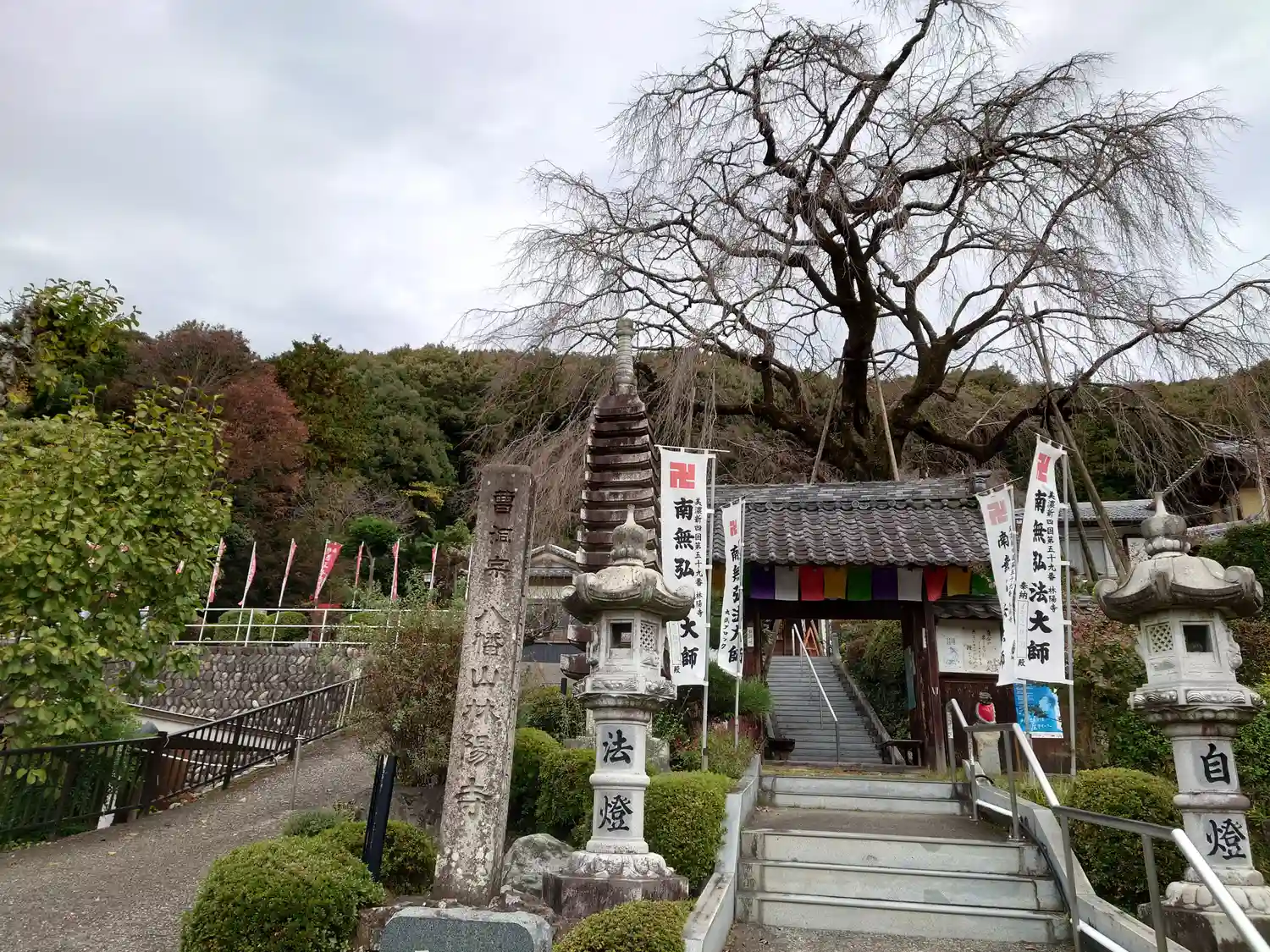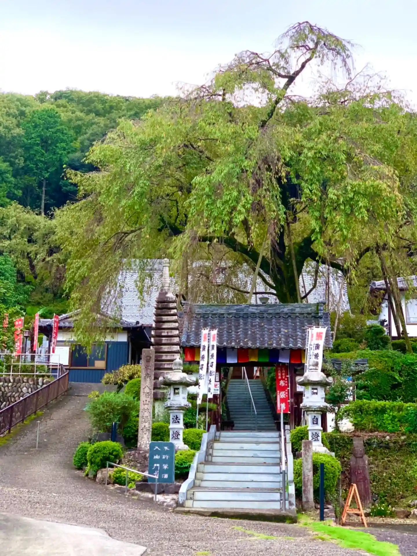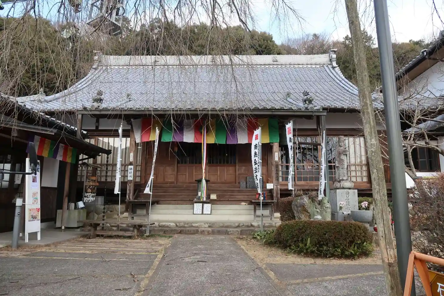 寺号標、山門、山門の後ろにはしだれ桜、樹齢150年あり岐阜市の指定保存樹となっています お寺の後ろに墓地がありその後方にもしだれ桜の子どもがきれいに咲くそうです
