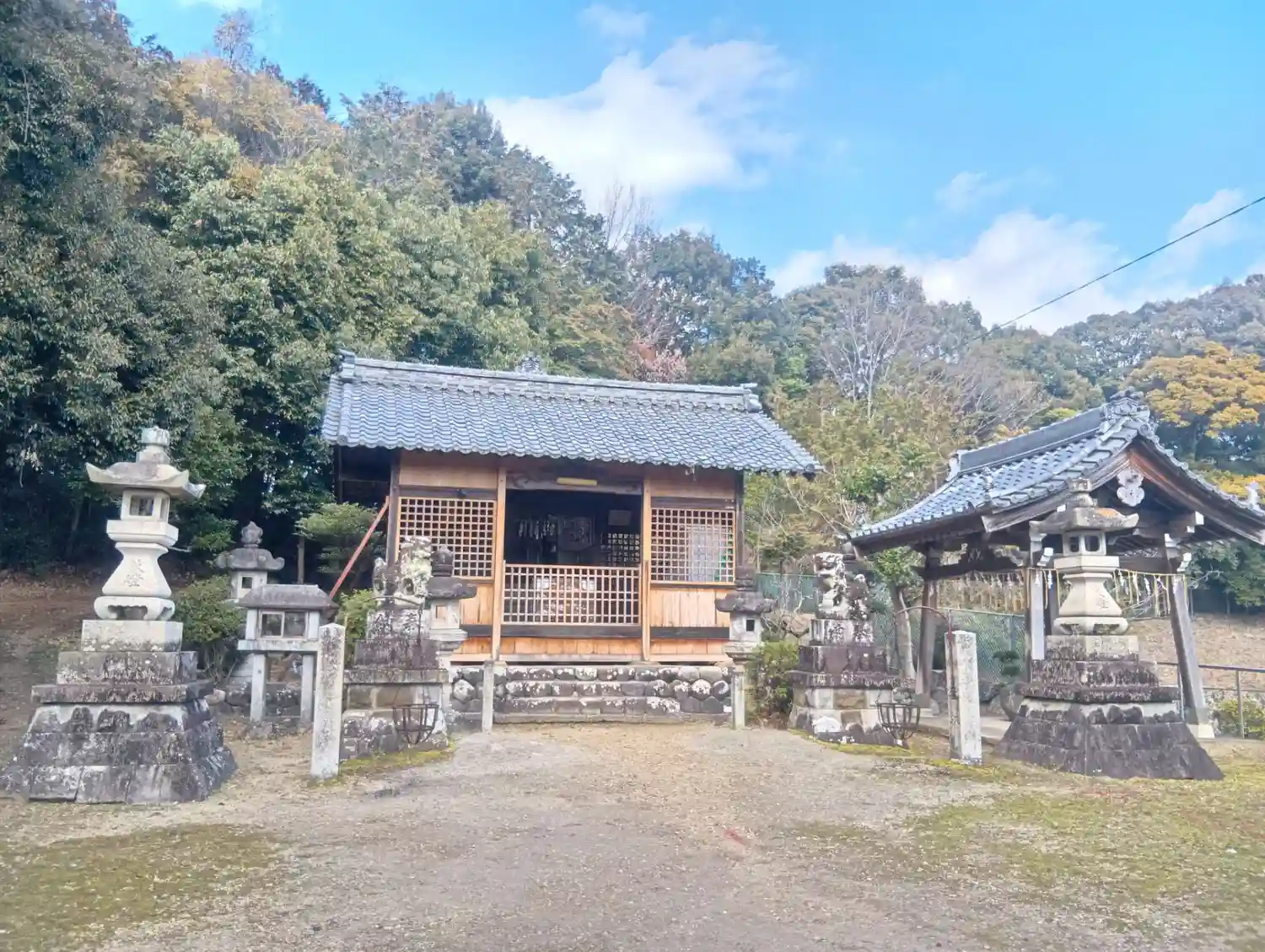 横長に社殿、秋…