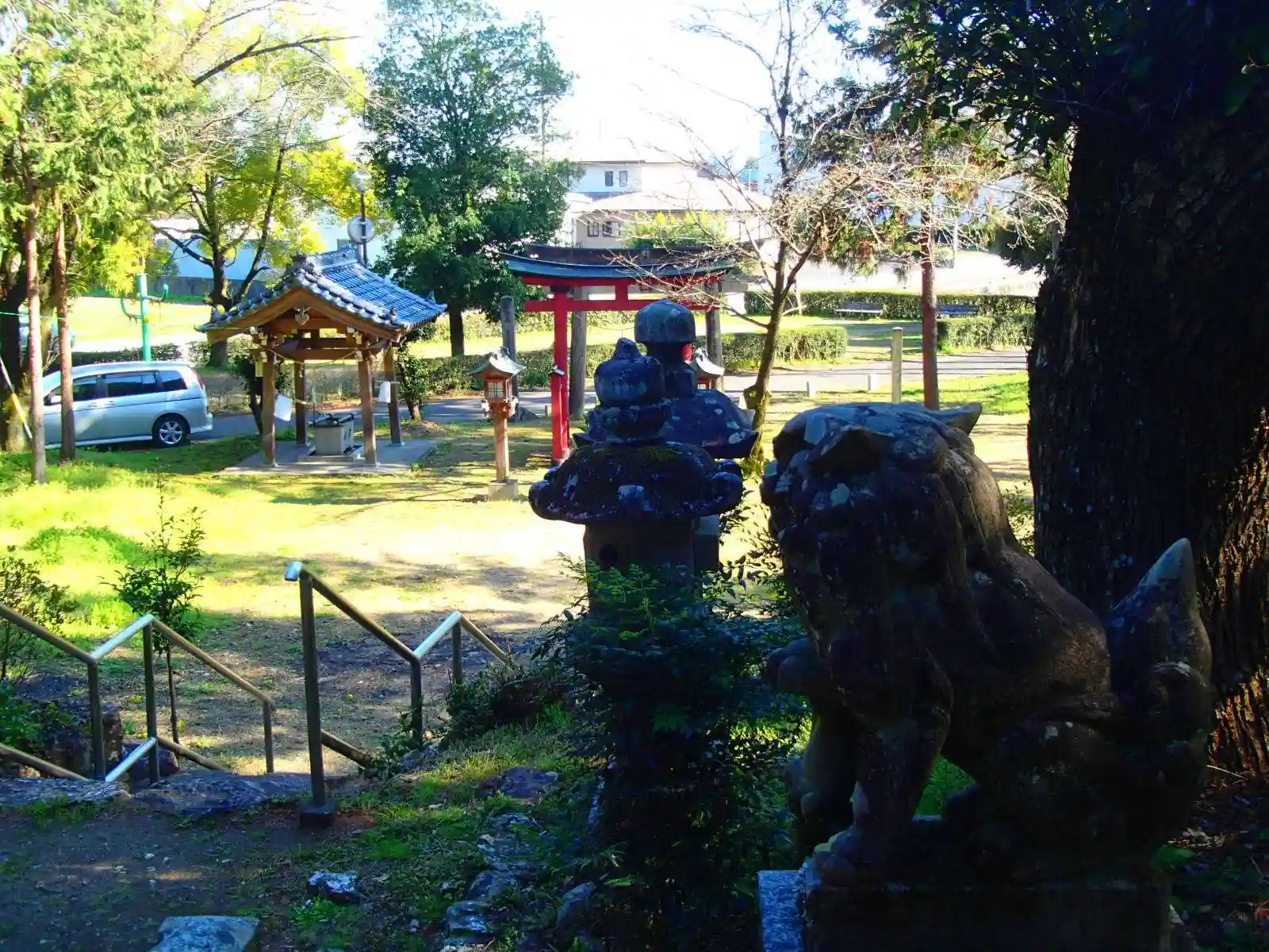狛犬目線。境内は結構広く、細い道路の向こうにとても小さな公園があります。