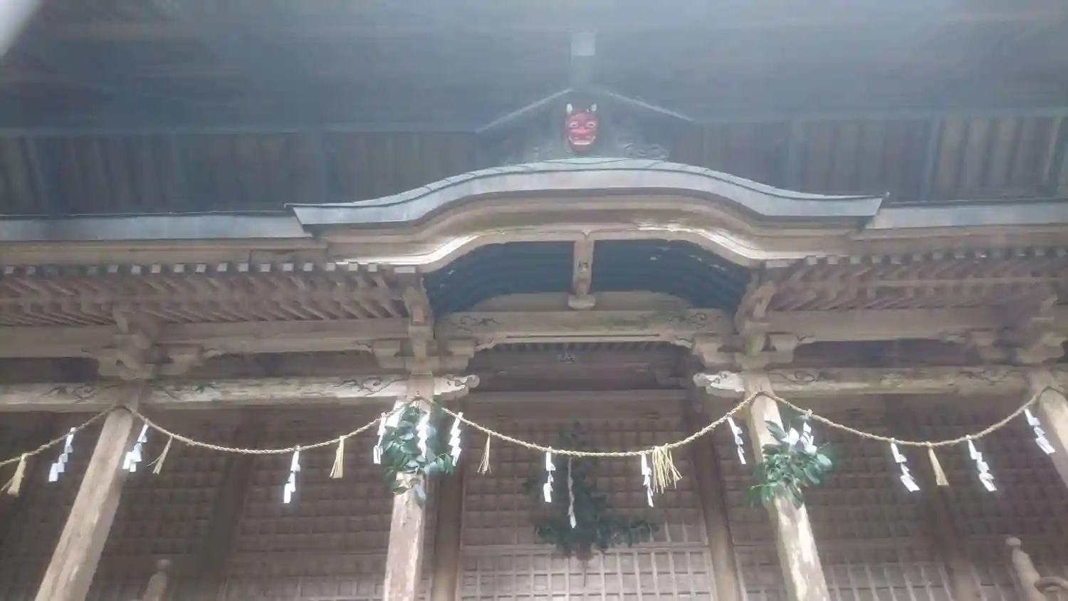 神社本殿の上には鬼の面が上がっていました。初めて見ました。