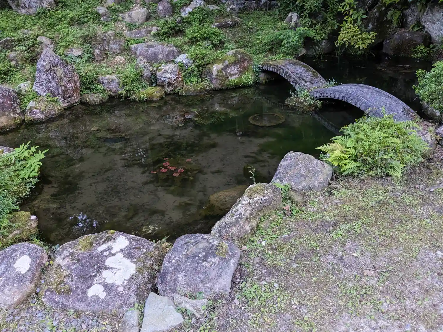 池 コイの姿は見えず 端の方で ジャンプの音がしました カエルさん?🐸