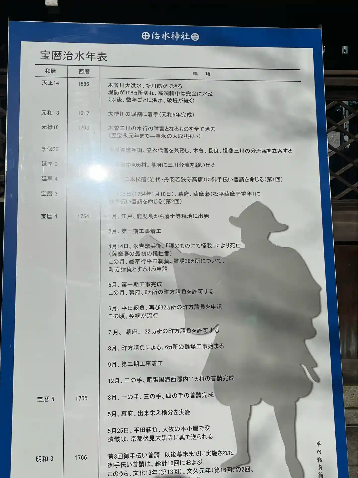 靱負は、宝暦4〜5年(1754〜1755年)、薩摩藩が幕府の命で行なった、木曽三川分流の治水工事(宝暦治水)の責任者でした。治水工事が終わると、莫大な工事費用と数多くの藩士が亡くなった事の責任を取り自害しています。