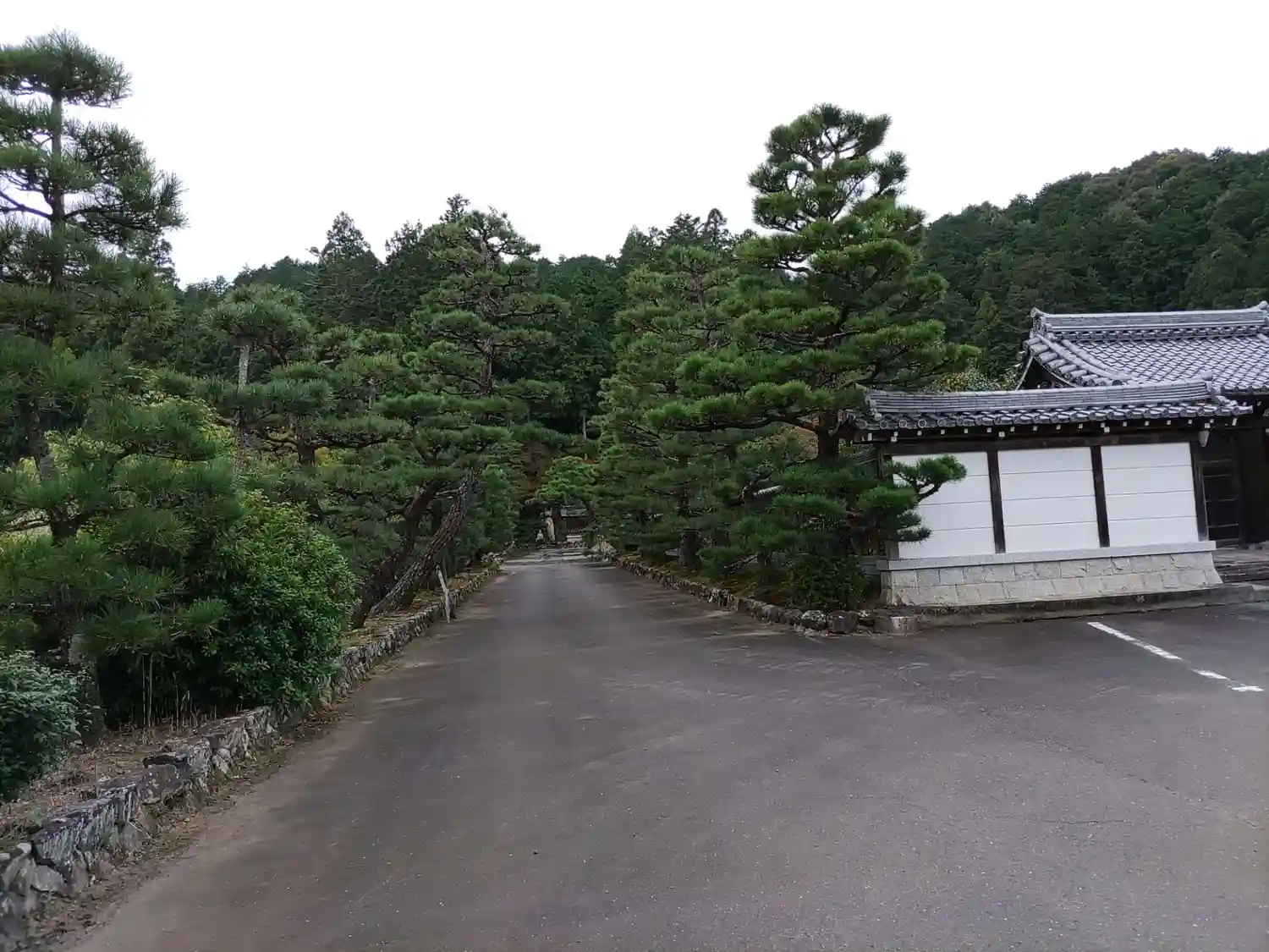 寺号標から真っ直ぐの参道、両側に松の木が植えられています。木に栄養剤?が刺さっていました。途中左側に大きな駐車場あります。