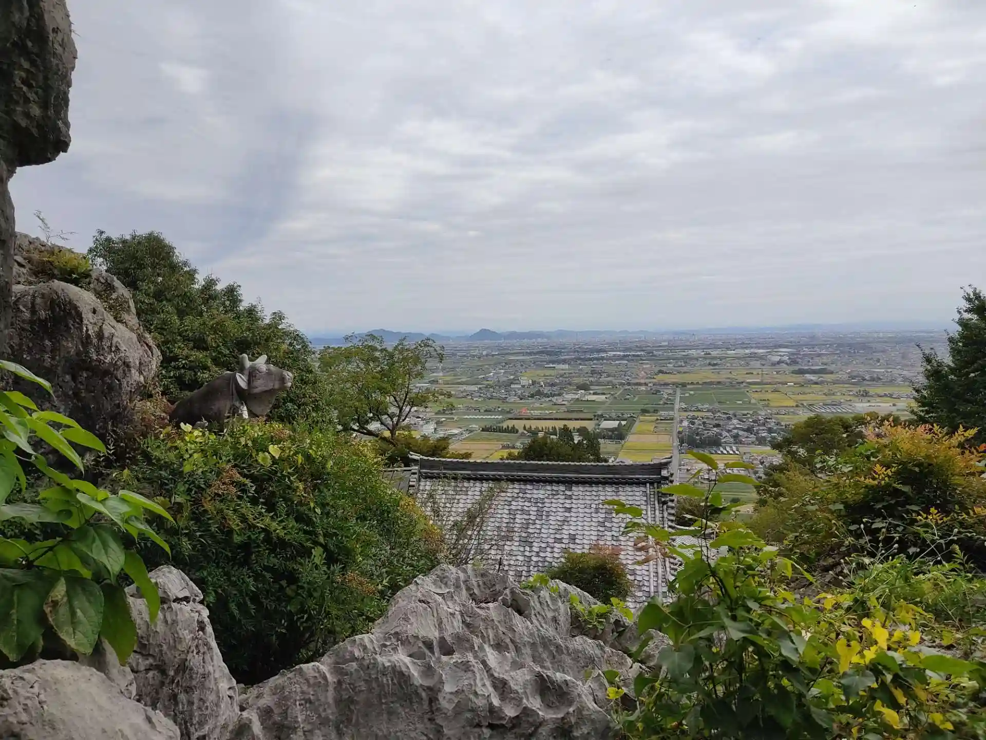 本堂の屋根ごしの濃尾平野