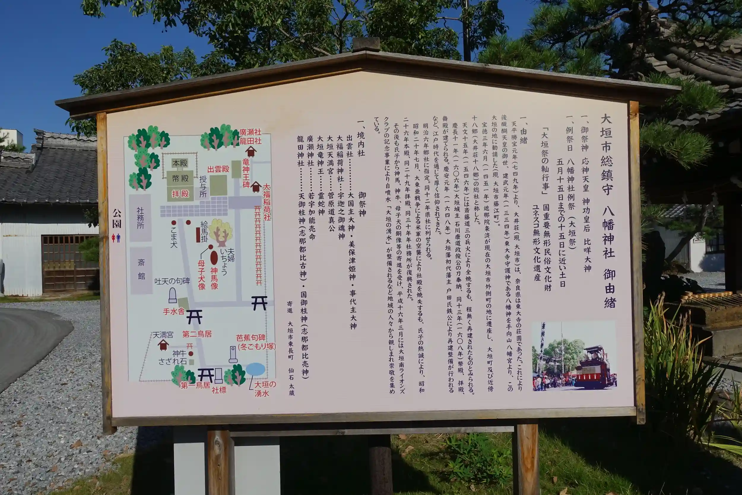 1334年(建武元年)に奈良にある東大寺の鎮守社「手向山八幡宮」の祭神をを勧請したのが始まりで、大垣市の総鎮守です。