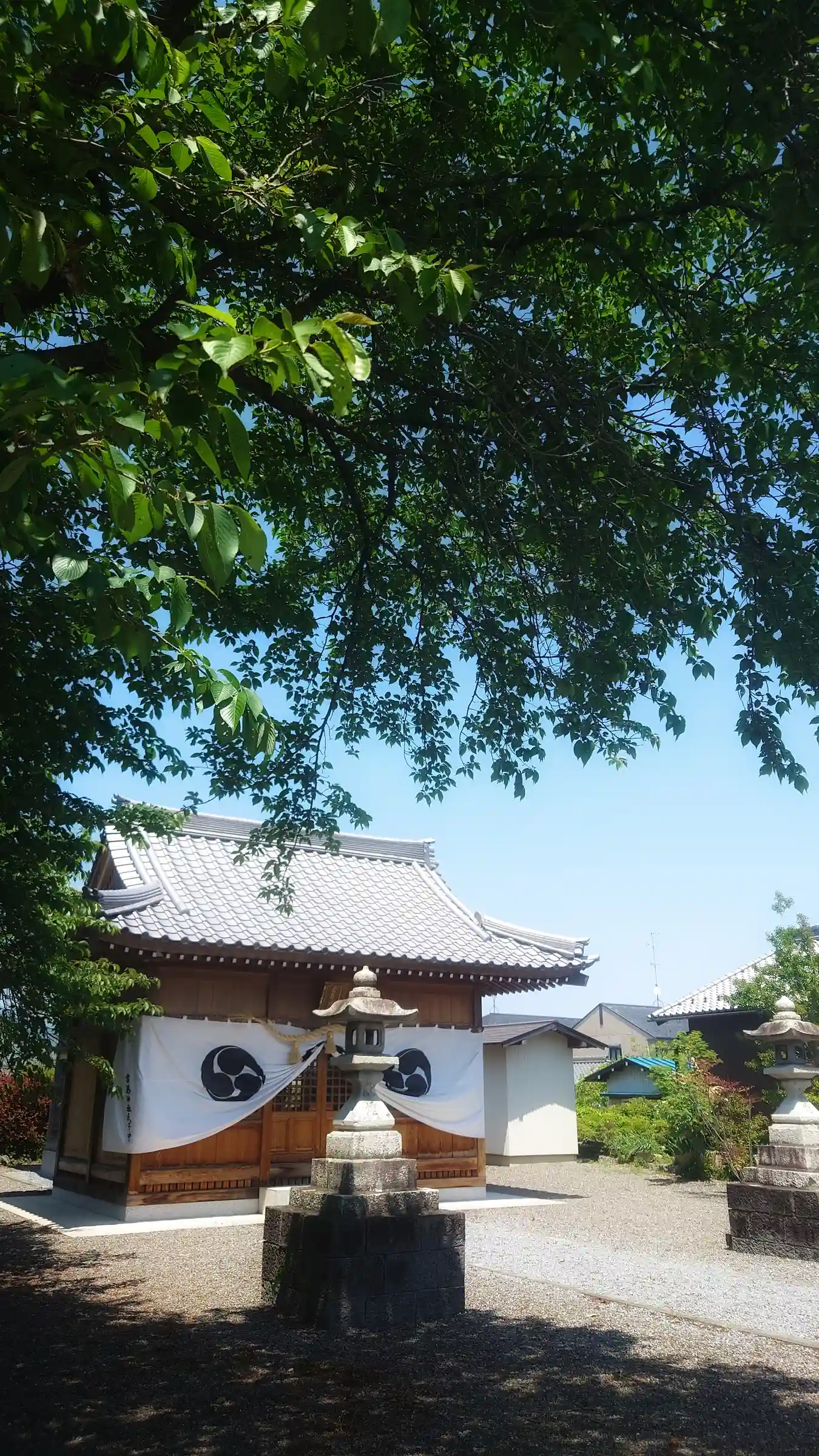 翌日の祝日に撮った石柱の写真から垣間見える社殿には幕…