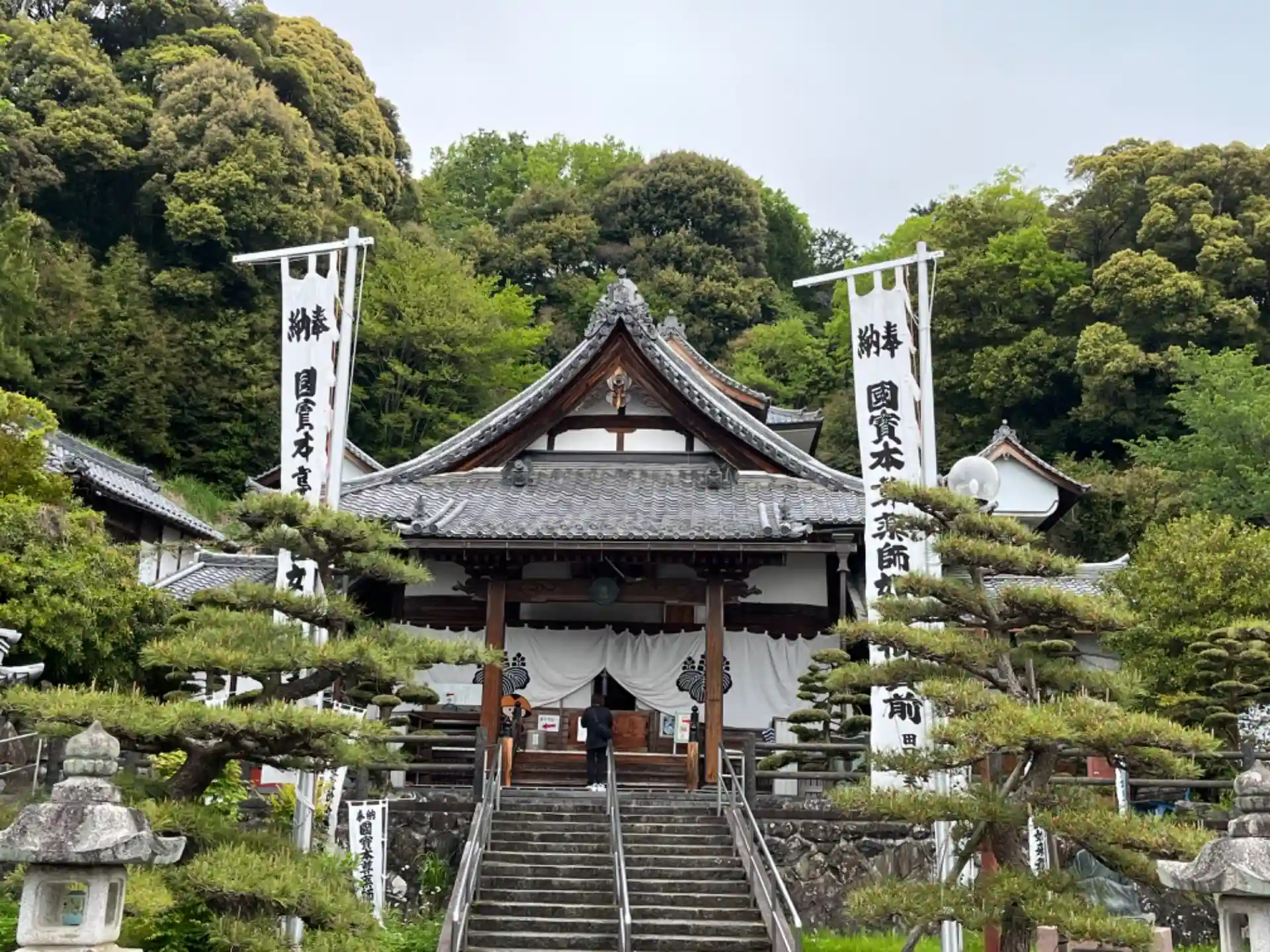 写真で見ると上手の建物にご本尊の薬師如来様がいらっしゃいます。写真撮ったんですが、手前のガラスにピントがあってしまっていました。