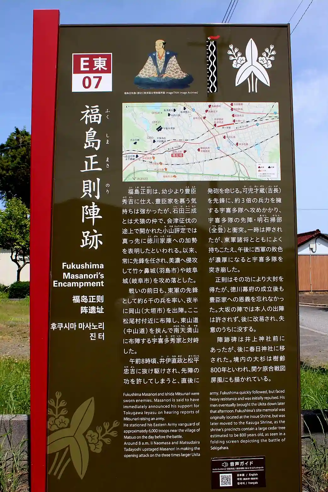 春日神社の境内には関ヶ原合戦時の福島正則陣跡があります。石田三成と対立していた福島正則は東軍に加担…