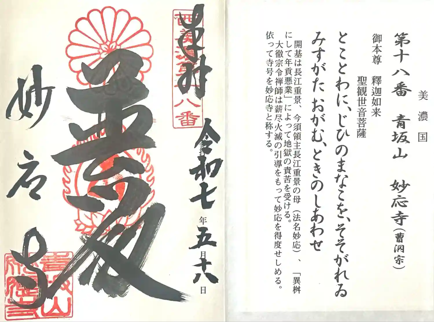 西美濃三十三霊場 第十八番札所。正平15年(1360年)、今須城の城主長江重景が母親である妙応尼…