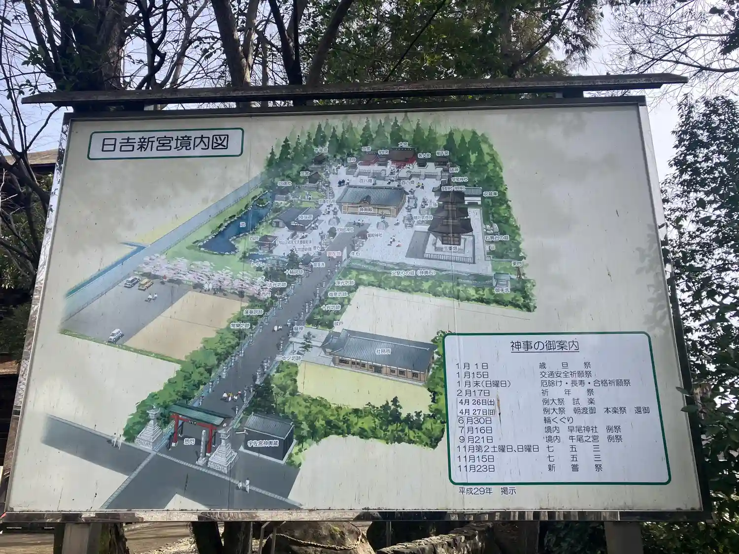 境内の案内板です。「〜宮」という建物がいっぱいあります。