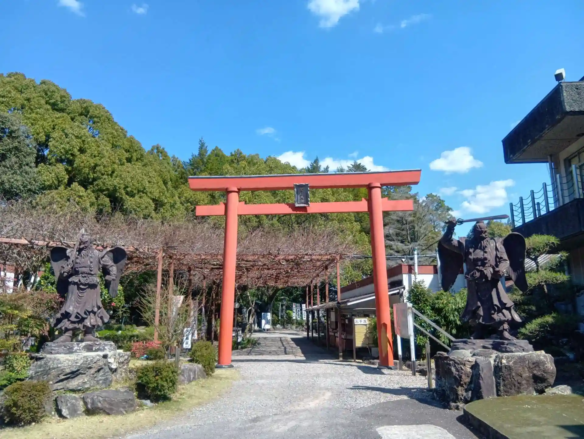岐阜県美濃加茂市森山町に鎮座する「天狗山 荒薙教(あらなぎきょう)」を初参拝させていただきました。境内のあちらこちらに天狗の銅像・石像がありました。御神殿には大きな天狗の木像と、数え切れないほど無数の天狗のお面がありました。社務所にて直書きの御朱印(500円)をいただきました。プレミアムフライデー金の御朱印対象神社です。「金の御朱印」をいただきました。とても丁寧にお書き入れしてくださいました。境内の駐車場をはさんだ反対側に天狗山があり、日本一の天狗像(高さ約16m)があります。とても不思議な神社でした。坂を登りきった境内の隣りに、参拝者用第1駐車場があります。