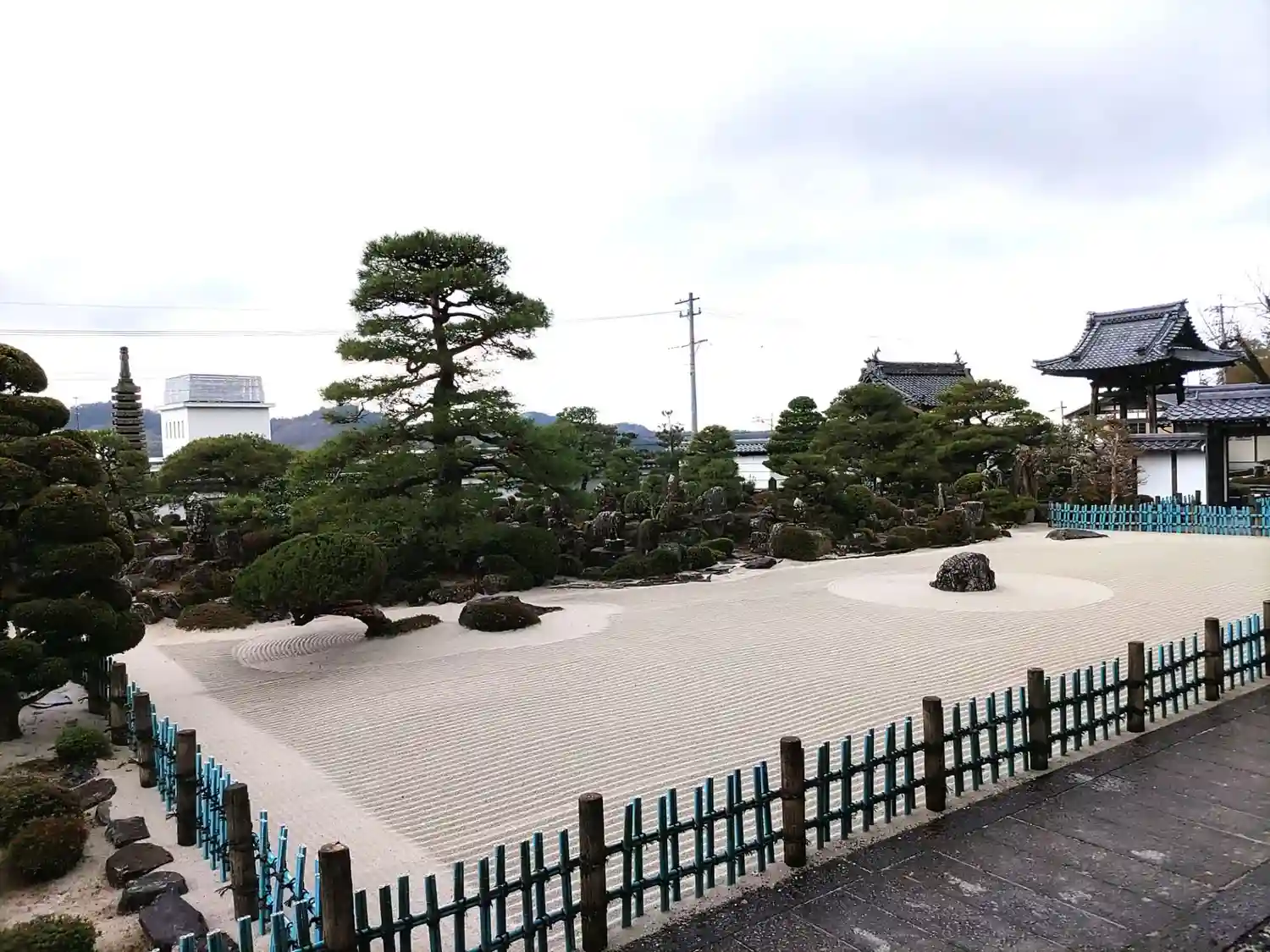 本堂からの石庭園 白砂が敷かれ、現在は3つの石と松が配されていますが、かつては7つの石が用いられ 臥龍形(臥して横たれる龍の形)を表現していたそうです