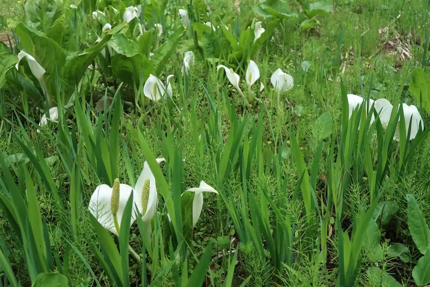 鳥居の横の湿地帯に水芭蕉