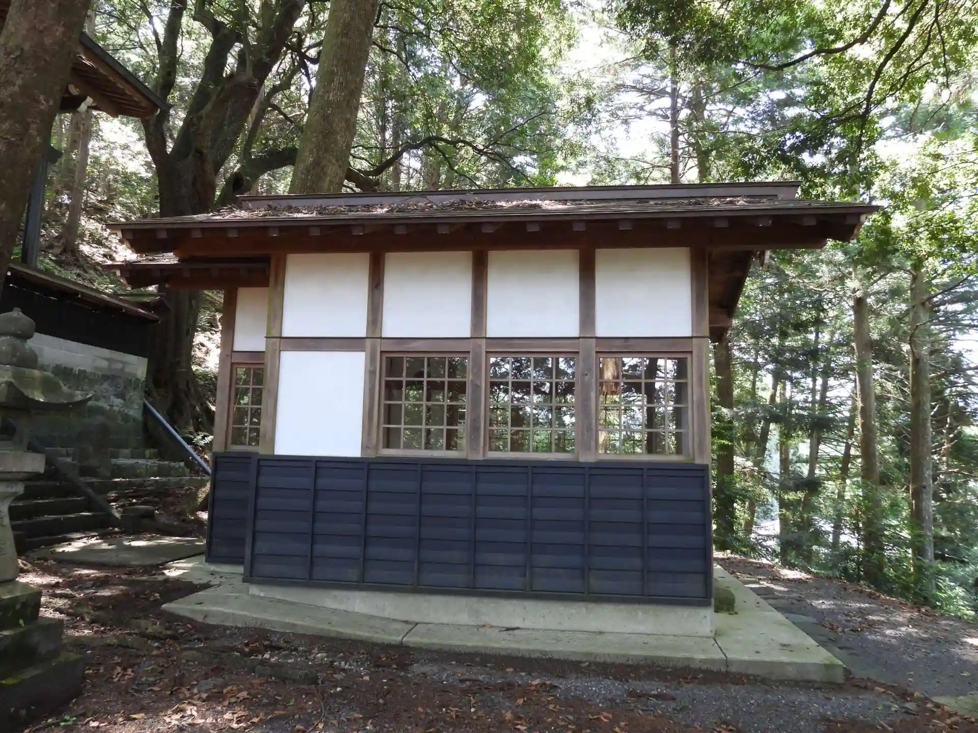 こちらの河辺神社は社頭に大きな杉の樹が目立ち、いかにも神社の入口の雰囲気を醸し出しています。本殿は境内から東の山に登っていく形です。この時間帯はまだ涼しく心地のよい石段登りでした。参拝を済ませ、境内に戻り立派な「神楽殿」を拝見します。やはり本殿同様に素晴らしい彫刻です。神楽殿の内部には「回転」できる舞台装置があり、祭礼の際に使われるものと思われます。