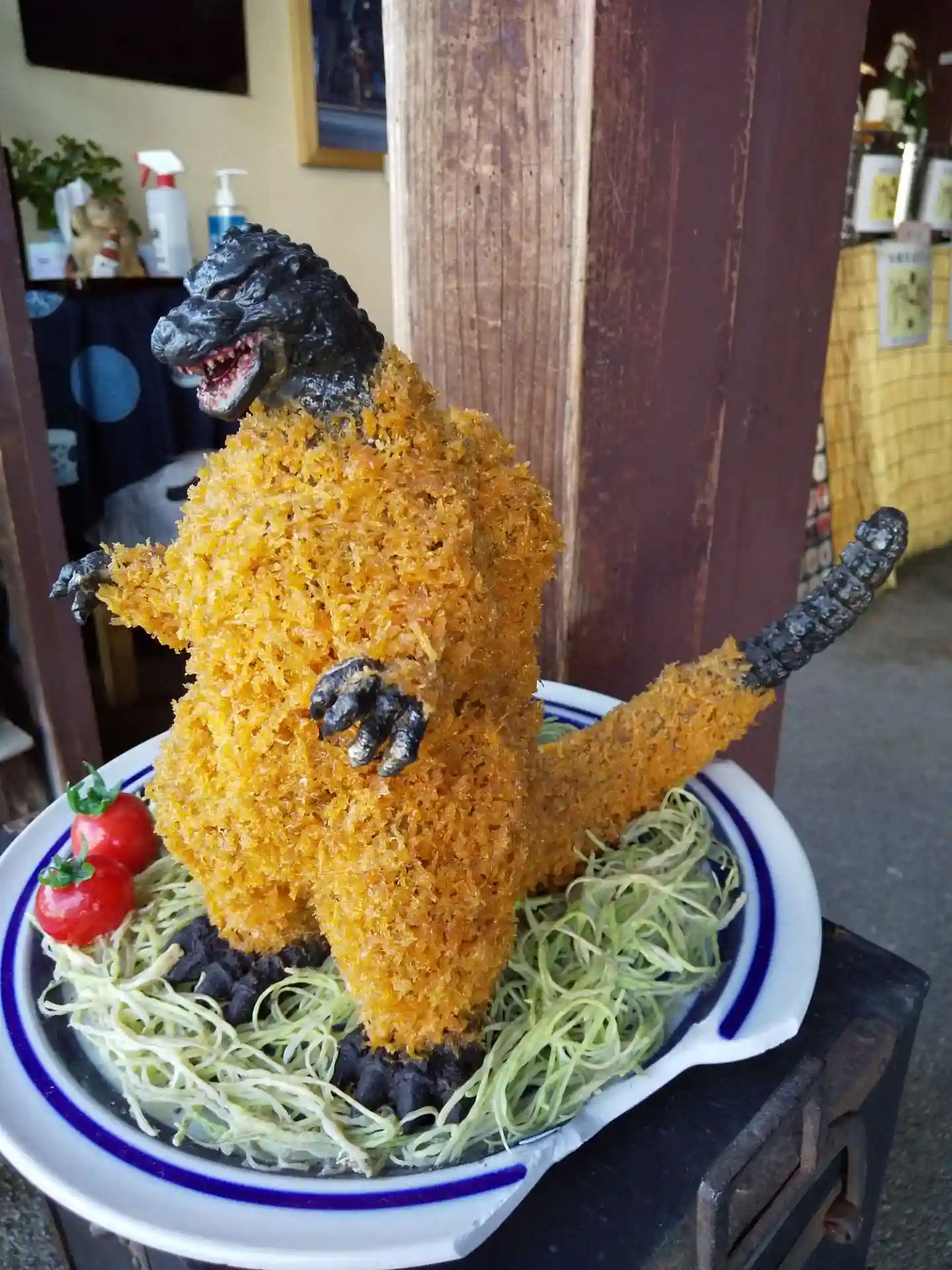 神社の近くの店先で「ゴジラのフライ」😆