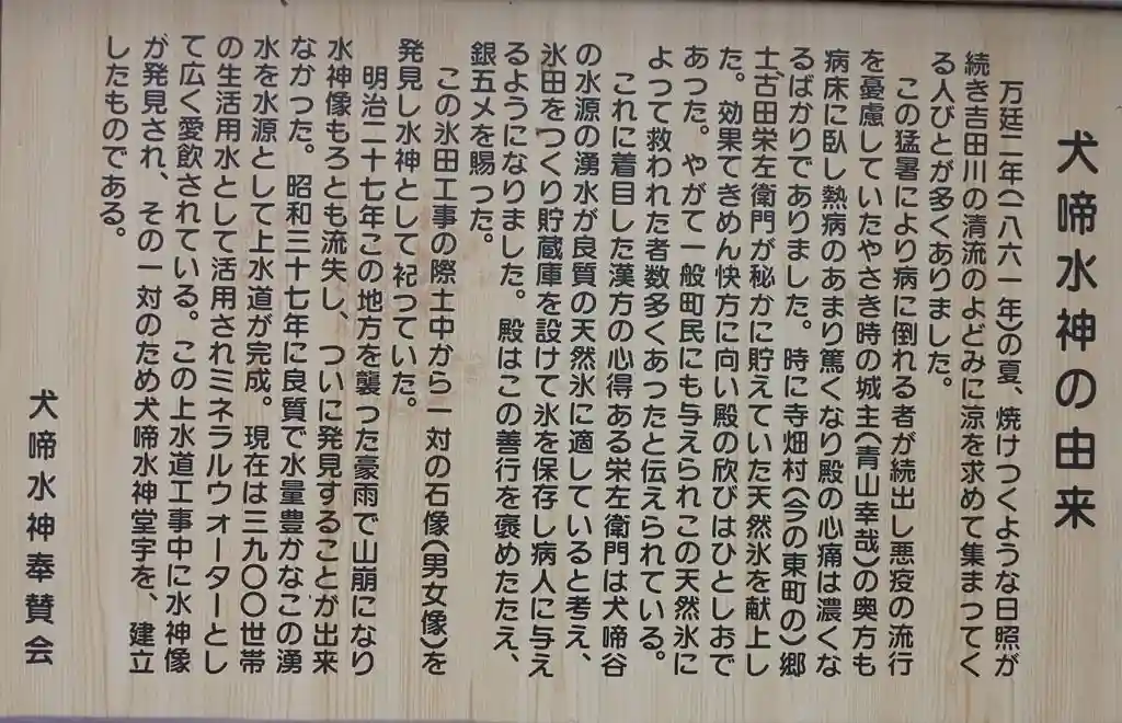 | ご由緒 | 湧き出る水の上に安置された2体の水神(地蔵表記もあり)は犬啼谷から出土したものです。