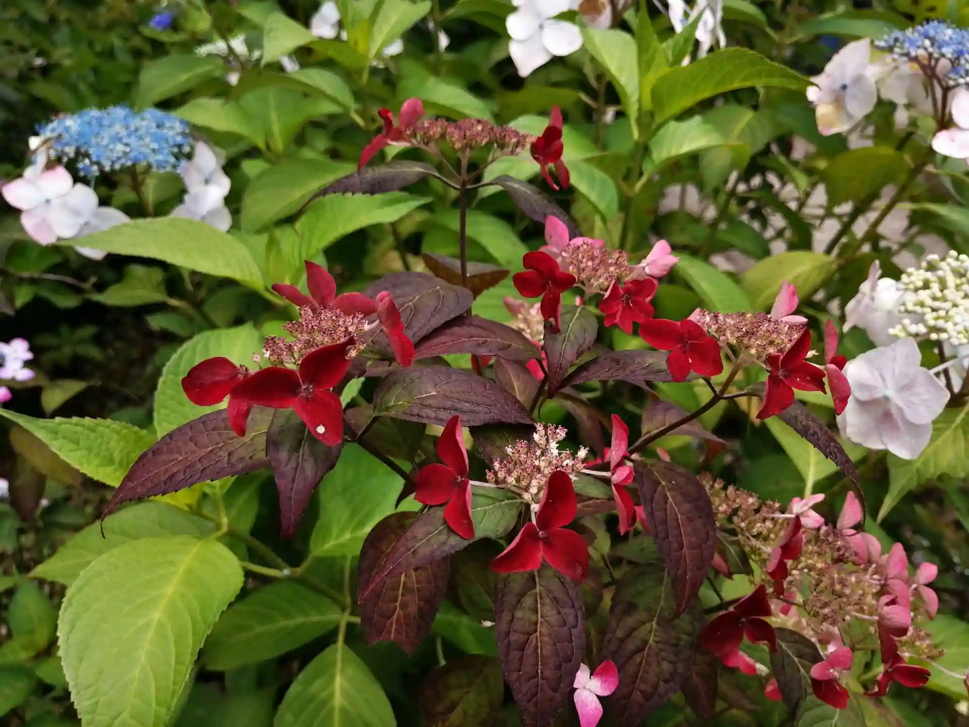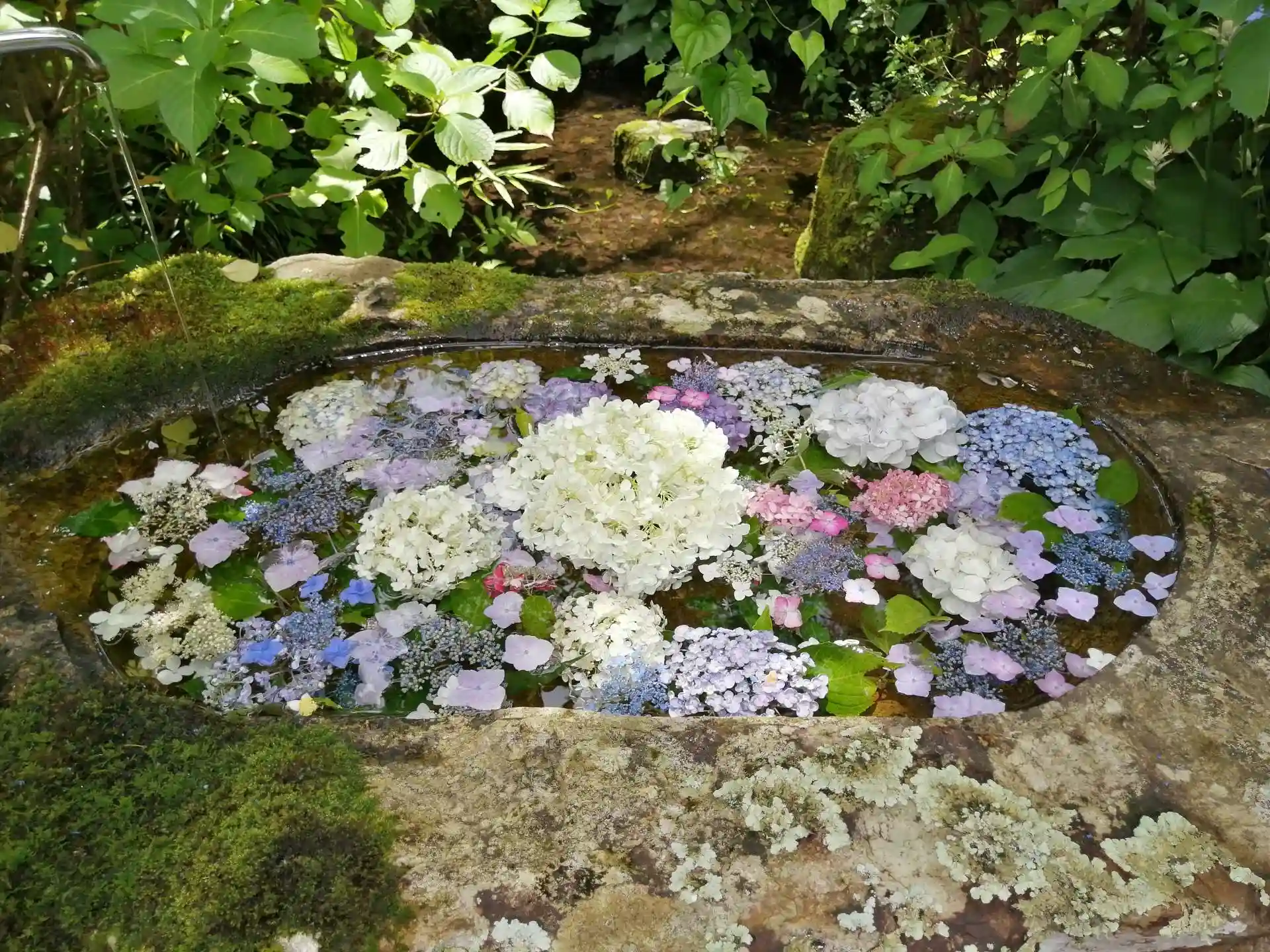 境内には色々な品種のあじさいの鉢植えが多数ありました。池の廻りにもあじさいが咲いており、綺麗でした。