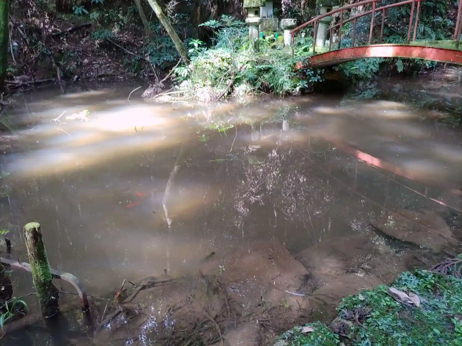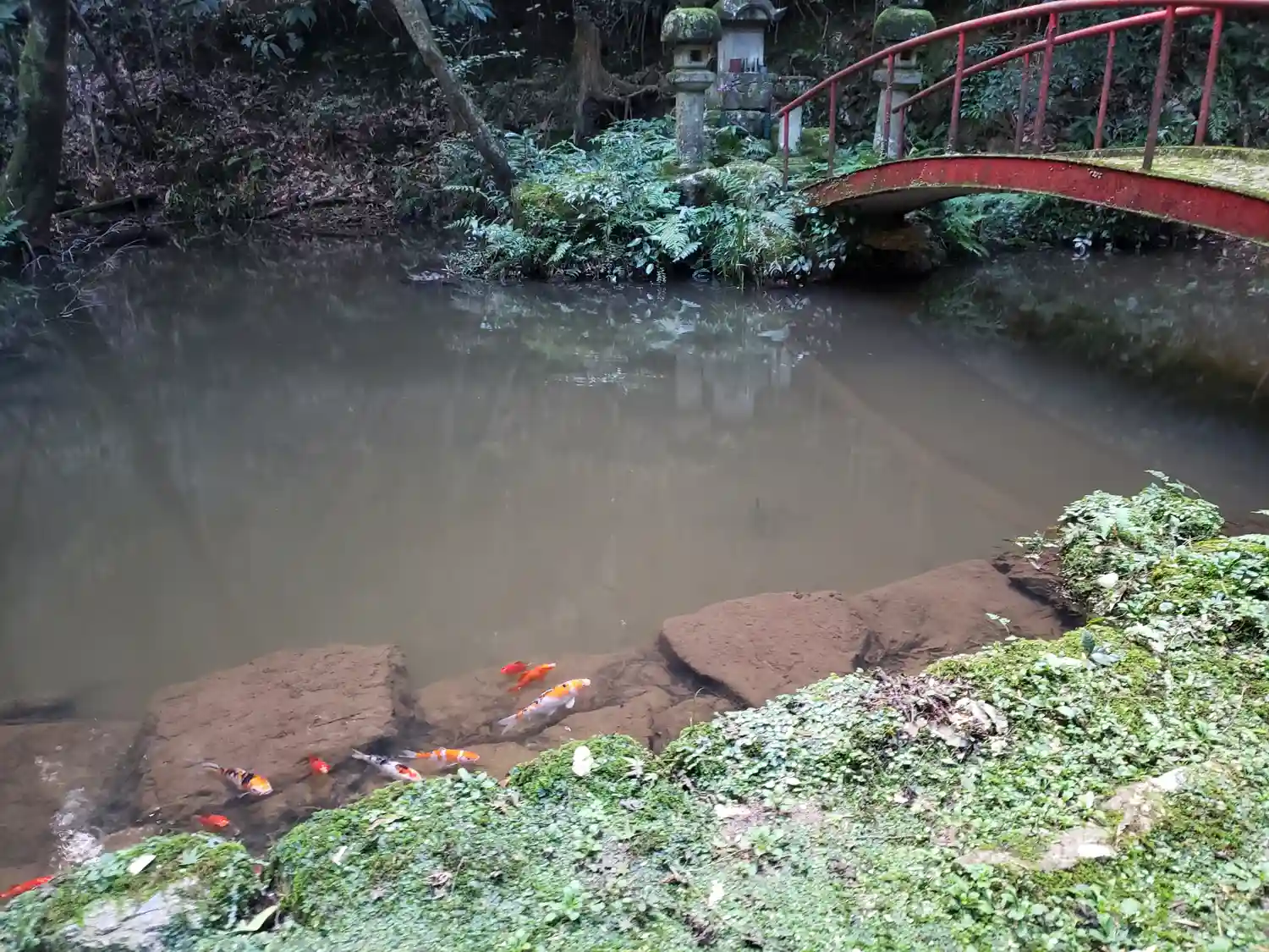 中間地点にある池 金魚?が仲良く泳いでいます