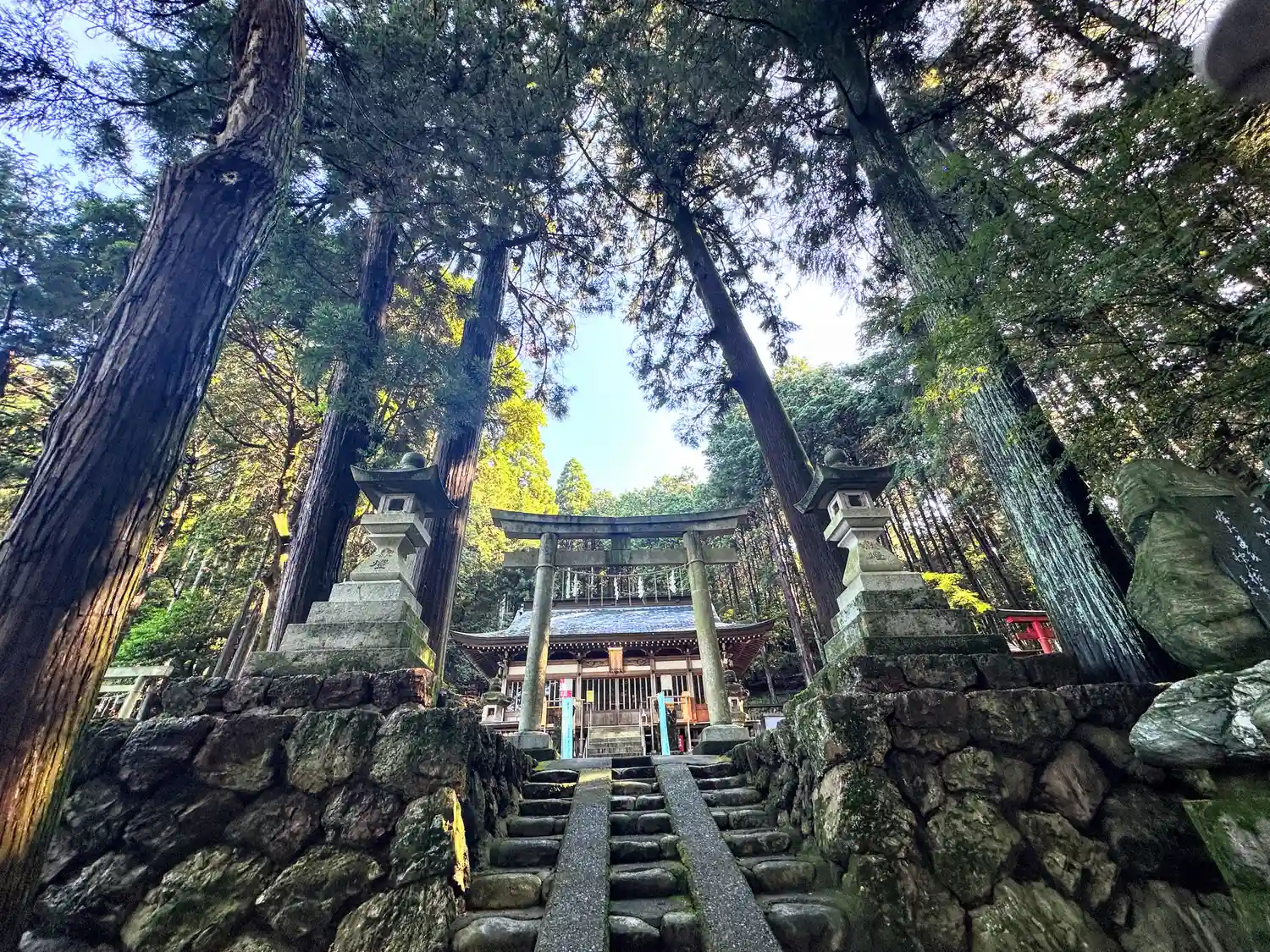 朱色の鳥居が映えます、参道から少し外れてところに 「夫婦檜」があります、2本の檜が途中で枝で繋がっ…