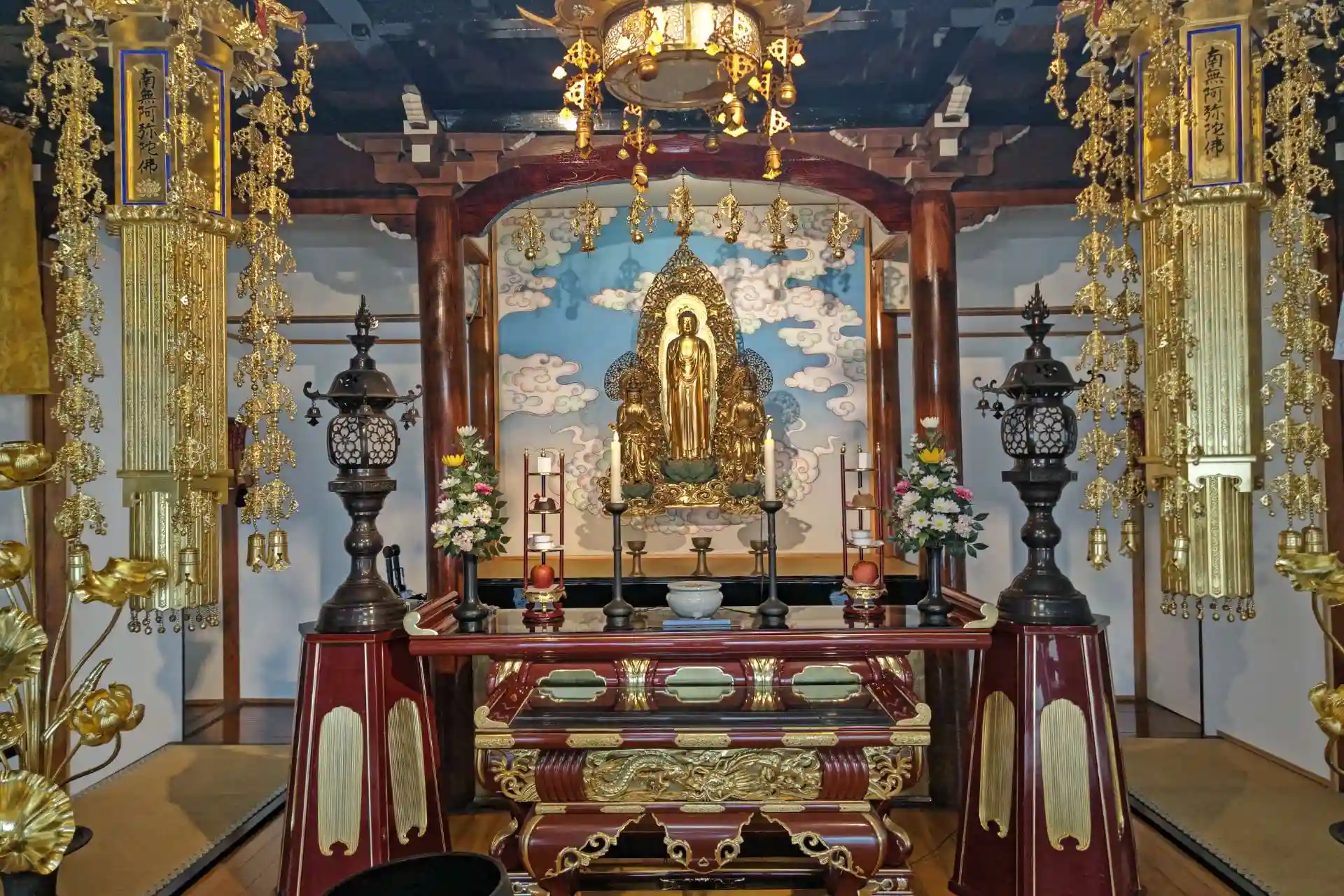 本堂には、台座の無い、空地に浮いた珍しい仏像である「往立空中の阿弥陀佛」が祀られている。