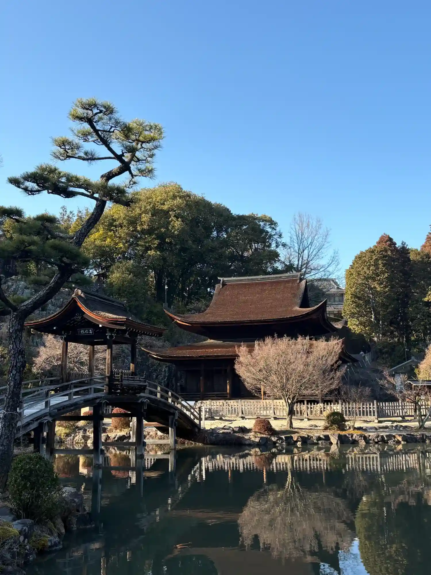 絹本着色千手観音像(重要文化財)のほか、夢窓や元翁の墨跡など数多くの文化財を所蔵し、観音堂前の庭園は臥竜池と称する池に反り橋の無際橋が架かり、浄土教的庭園の様式を感じさせる名庭で、国の名勝に指定され、建築・庭園・墨跡など禅の美術で注目される禅寺です。