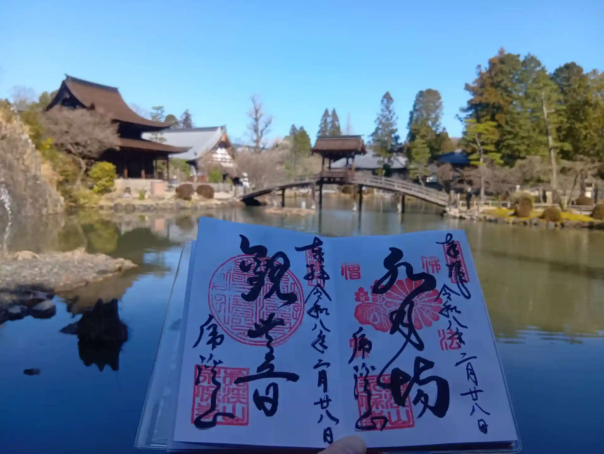 岐阜県多治見市虎渓山町に鎮座する「虎渓山 永保寺」を参拝させていただきました。もう何度も参拝させていただいております、私が一番好きな寺院です。聖観世音菩薩を御本尊とする、臨済宗南禅寺派の寺院です。一年を通していつでも美しい境内を拝観できますが、樹齢700年のイチョウの葉が黄色く色付く季節が、最も美しいです。国宝に指定された本堂である「観音堂」(1314年創建)と「開山堂」(1352年創建)は圧巻です。池泉回遊式庭園は国の名勝に指定されています。庭園の池にかかる太鼓橋「無際橋」は日本百名橋のひとつです。以前は渡ることができましたが、現在は通行不可となっています。直書きの御朱印2種類いただきました(各500円)。永保寺絵はがきセット(7枚入り・400円)もいただきました。永保寺オリジナル御朱印帳・2色無地(紺色・えんじ色)もあります。表紙の下部に金色の無際橋の絵柄が入っています。いつ伺っても、美しい境内の景色に癒されます。またぜひ、参拝させていただきます。少し離れた踏切の手前に、永保寺参拝者専用の大型駐車場があります。