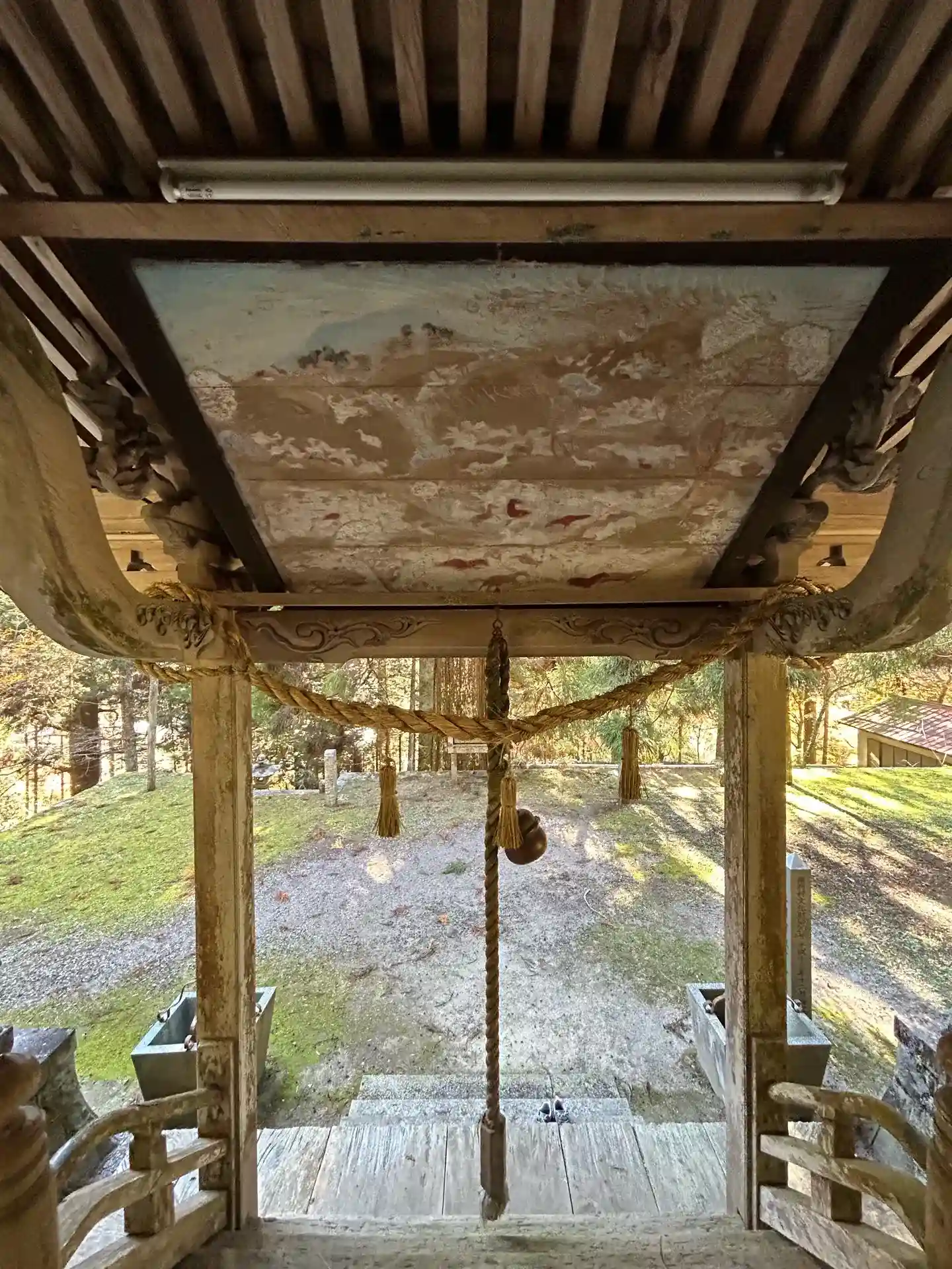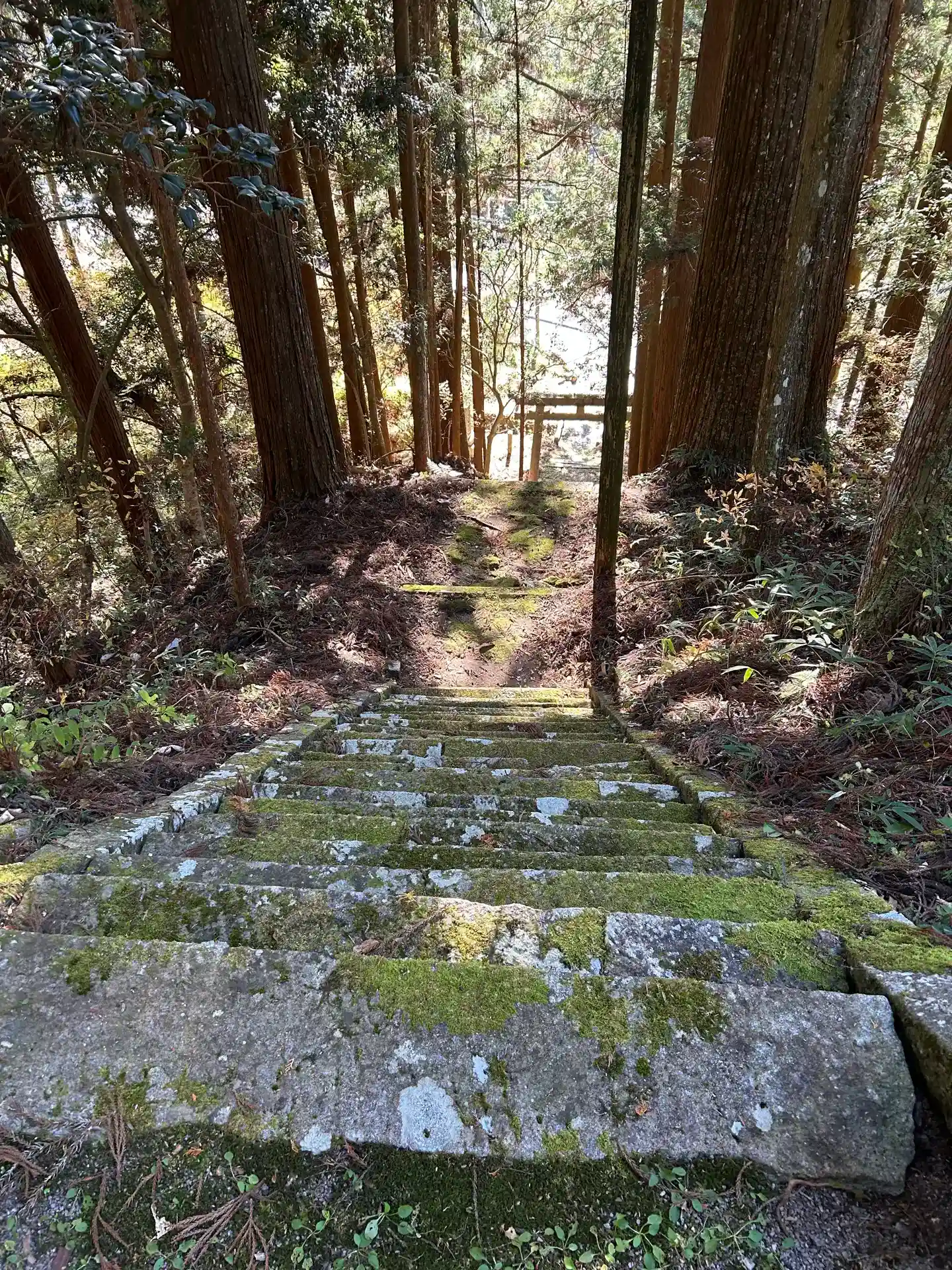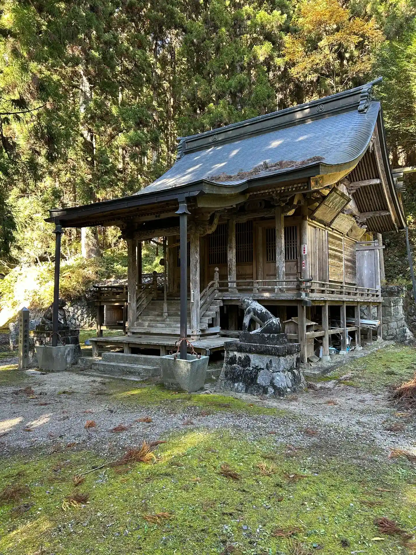 長い階段を上がると境内へ到着。とても大きな杉が2本あり、思わず息を飲みます。凄い。境内の神秘的な雰囲気も相まって感動。その杉は推定樹齢300年以上の村の天然記念物でした。