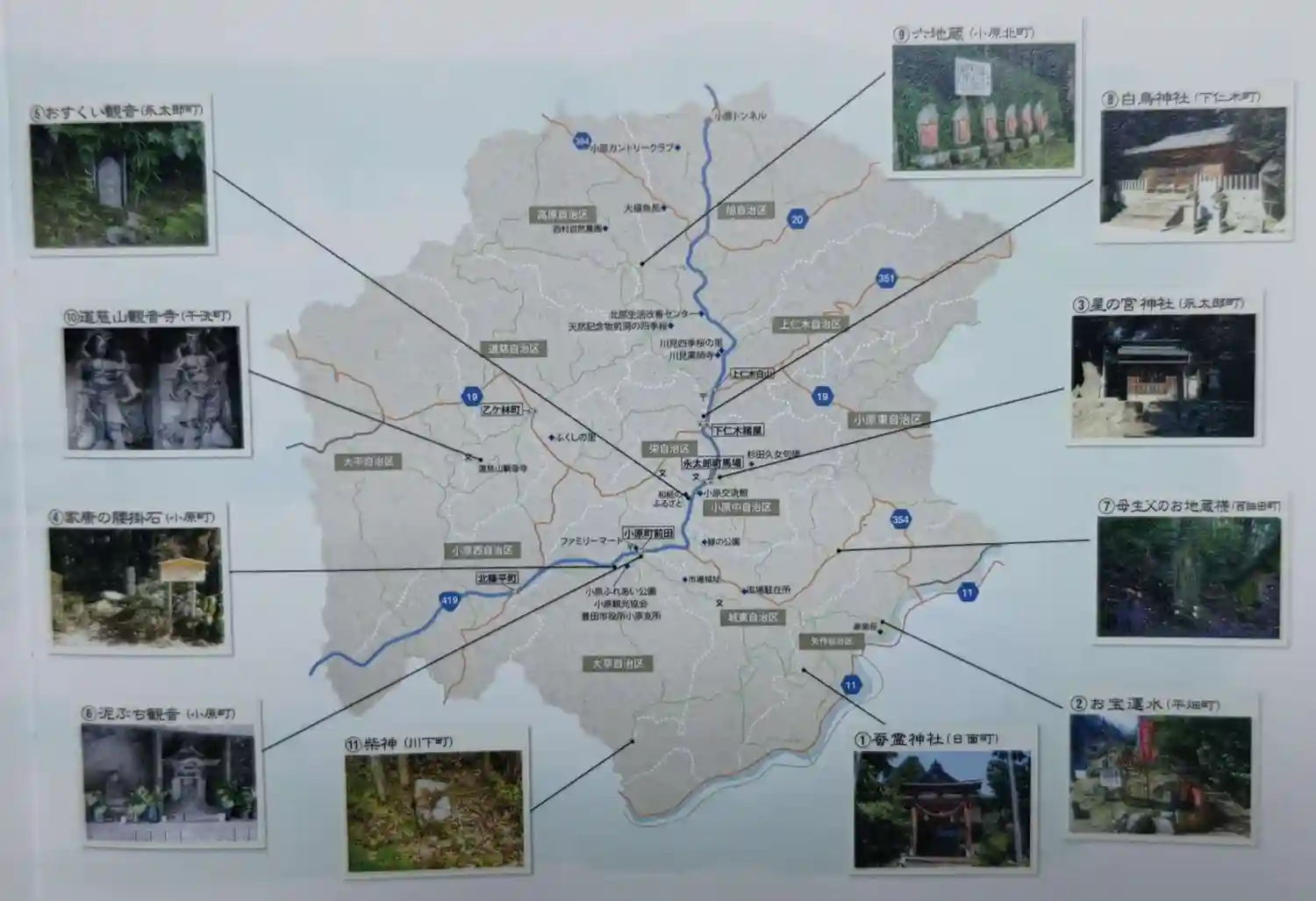 11ヶ所の位置をそれぞれ指しています。住所も載っていますが車のナビには載ってないのがほとんどなので近くに車を駐め、歩いて探しました。