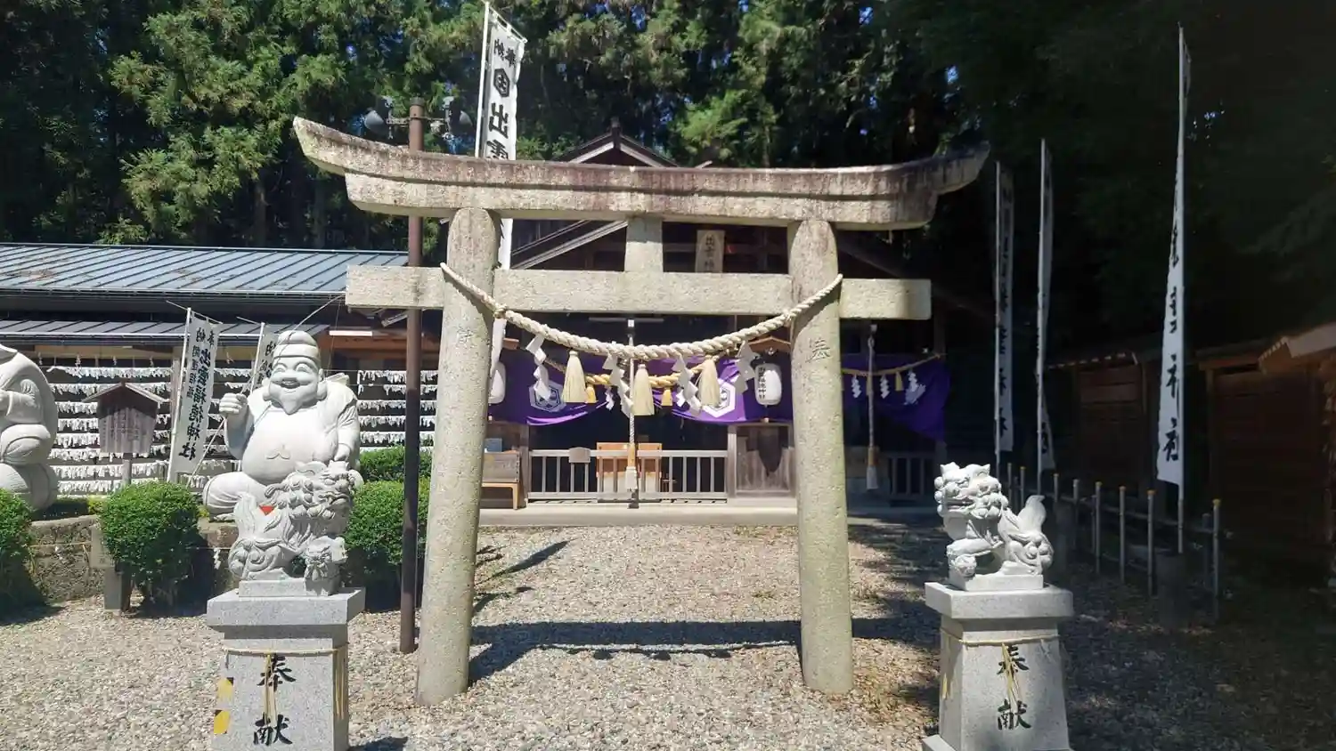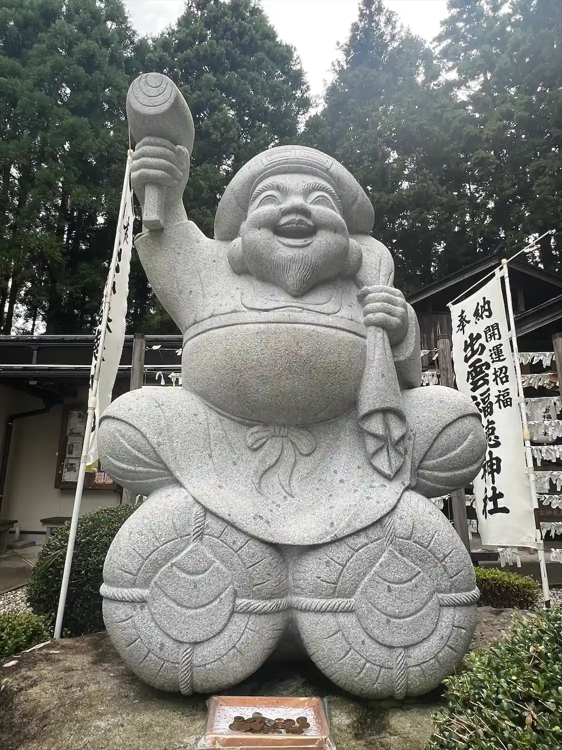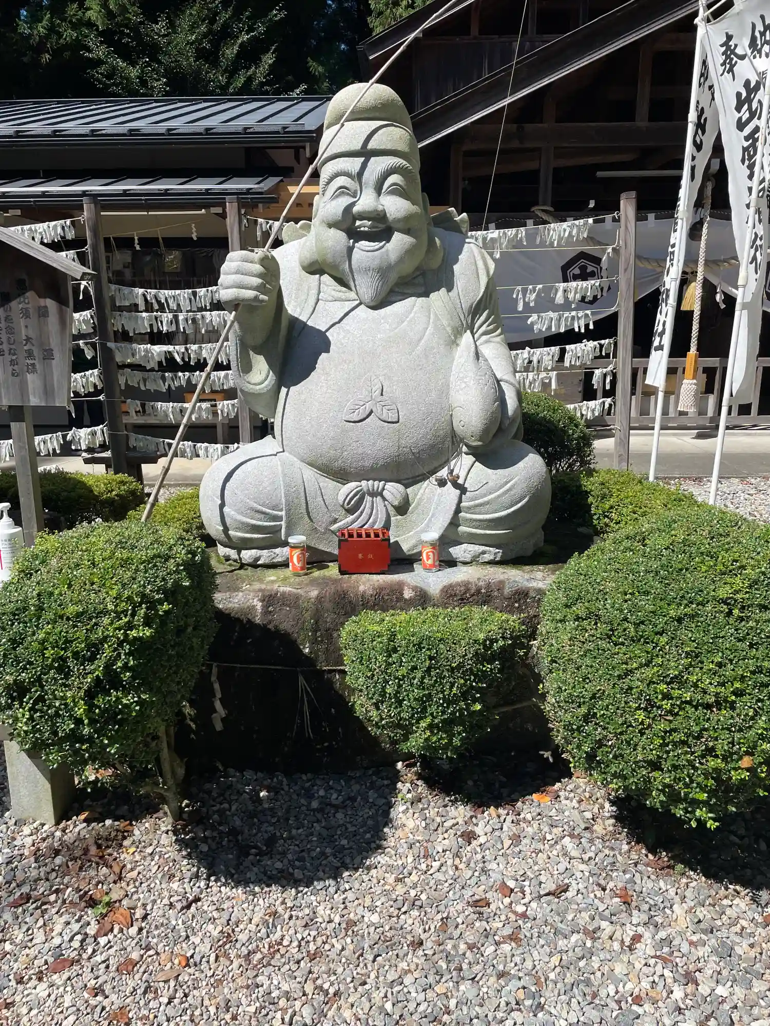 大きな大黒さまとエビスさまの銅像がありお腹をさす…