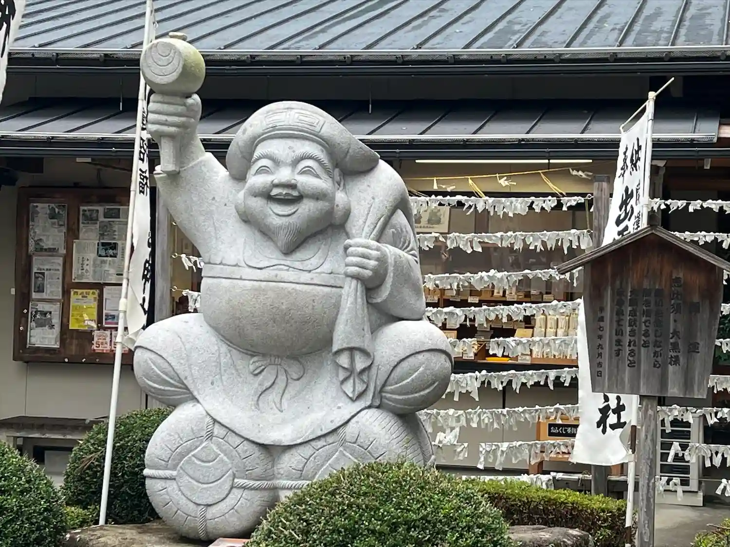 社務所前には大黒様と恵比寿様の石像があります。