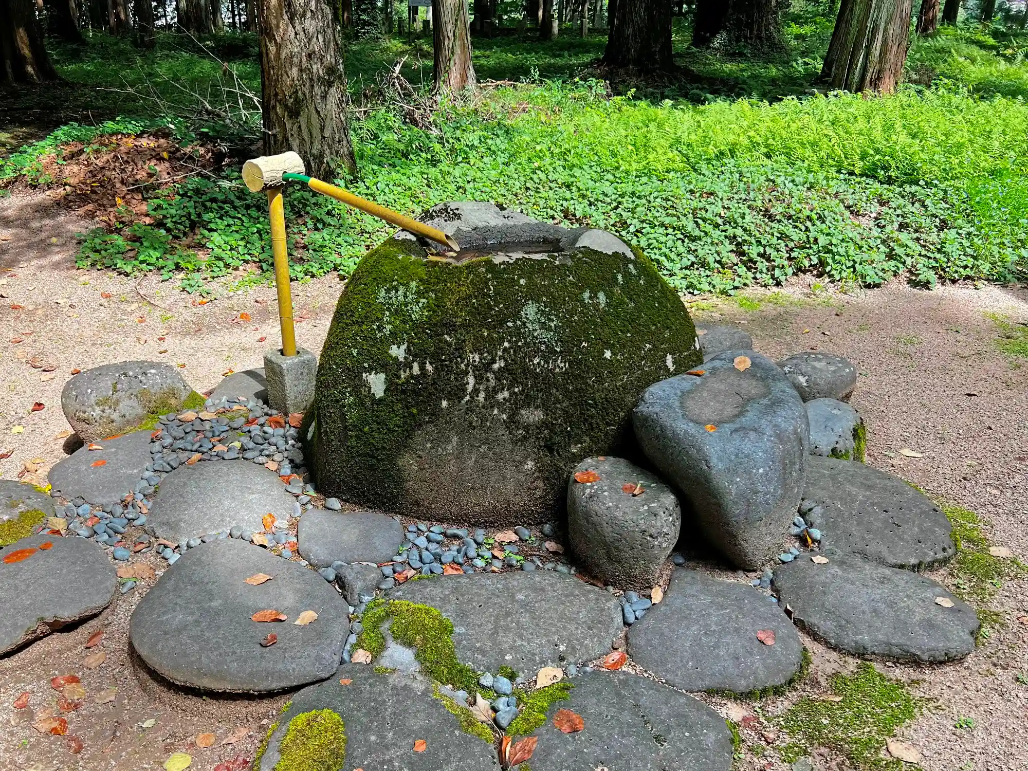 社殿近くにある<手水盤>。小さくて可愛らしい。ちゃんと苔生している。