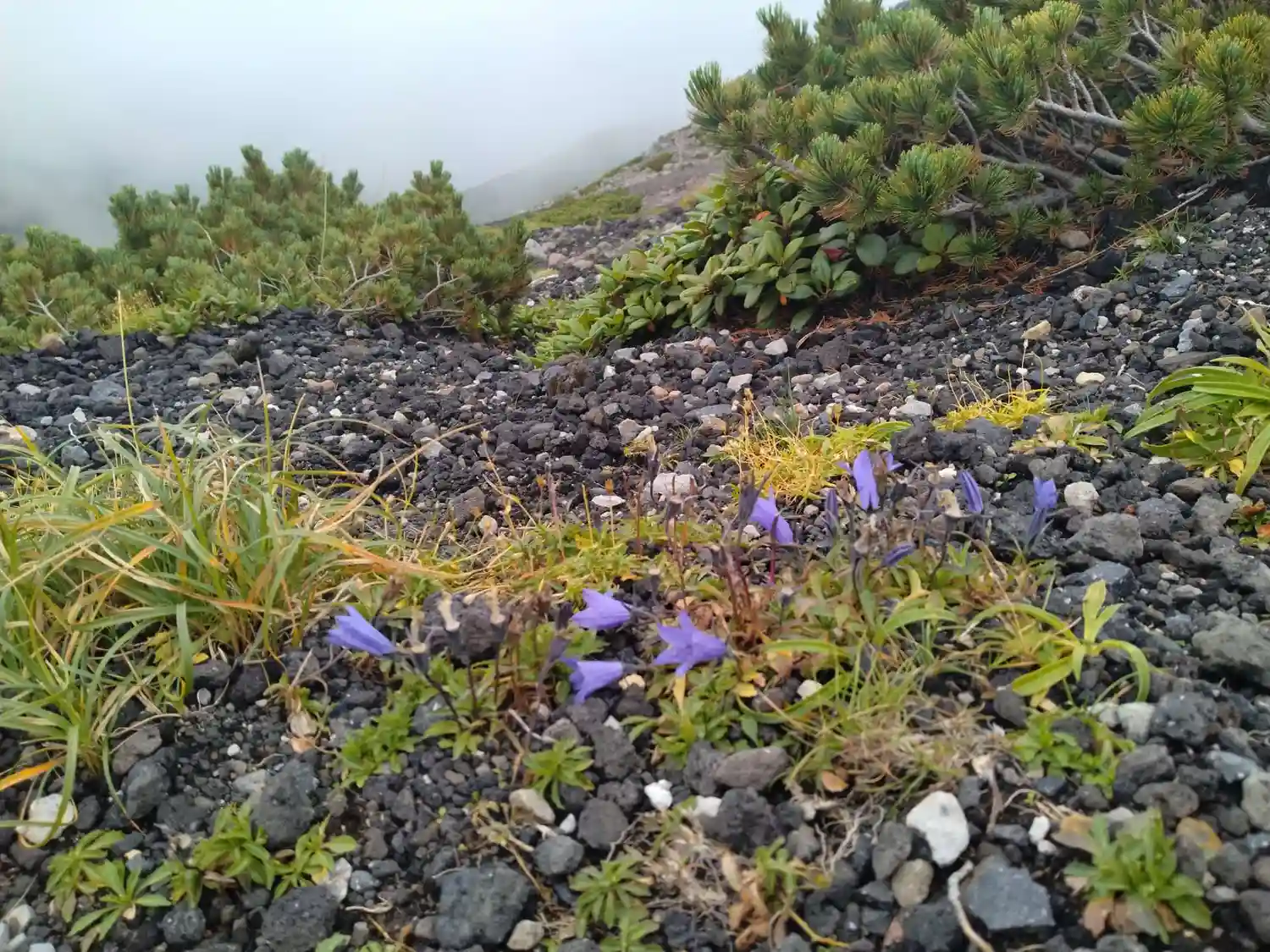 高山植物を眺めながら霧…