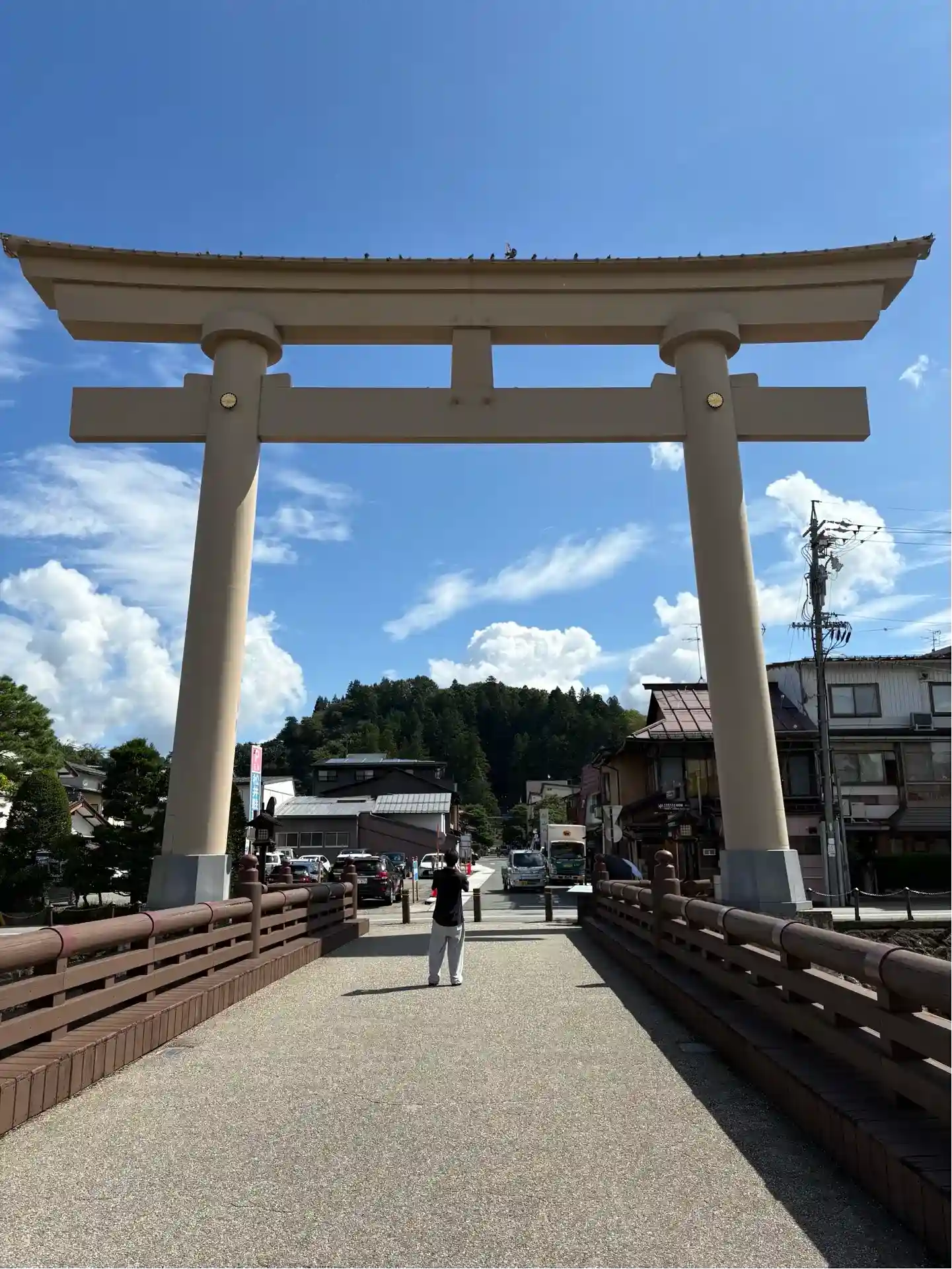 高山市宮川沿いは朝市の開催で大賑わい。露店や商店を見て回りながら遠くから見てもその大きさが分かる鳥居を目指しました。