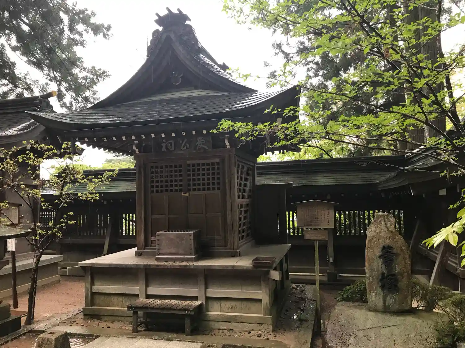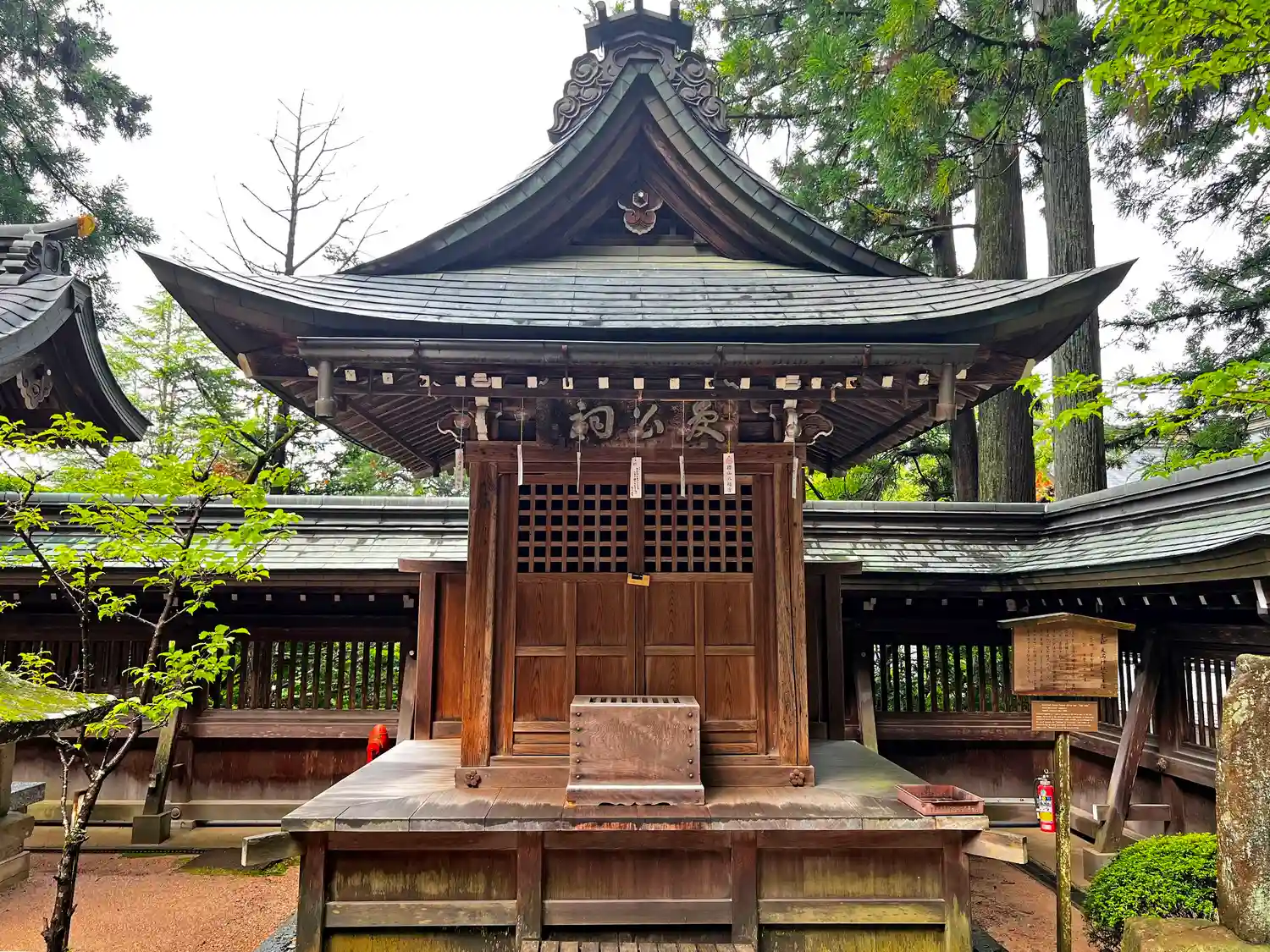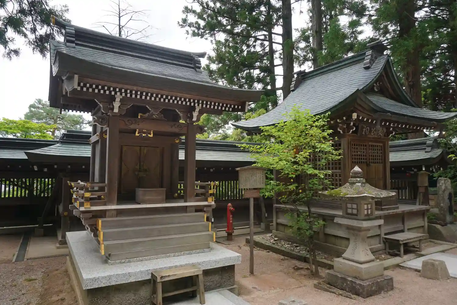 拝殿前から左方向を向くと、拝殿から建物がいくつか連なっているのが見える。