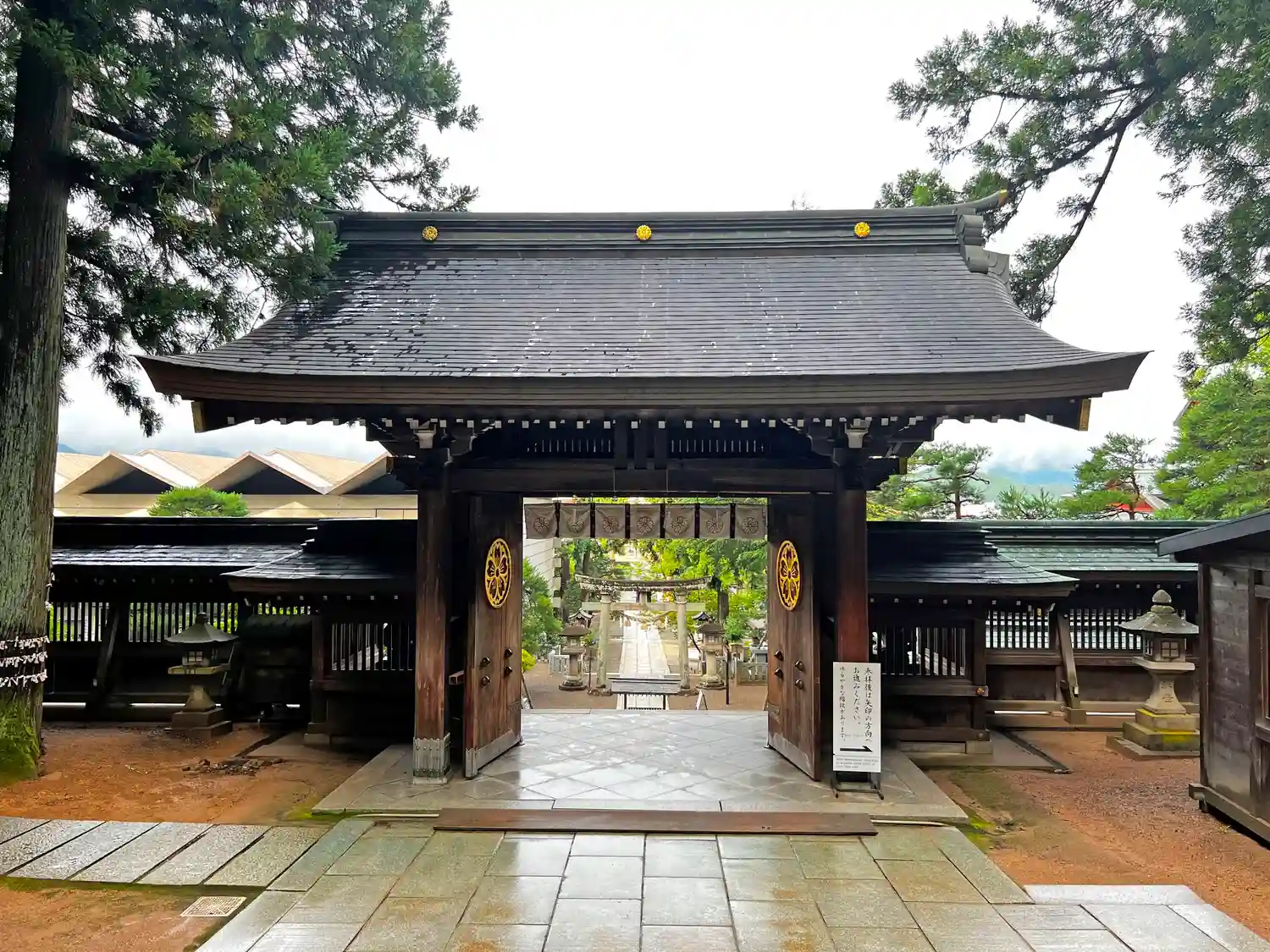 こちらは境内西端入口全景。土砂降りの荒天で、参道はつるつる、ぴかぴか。