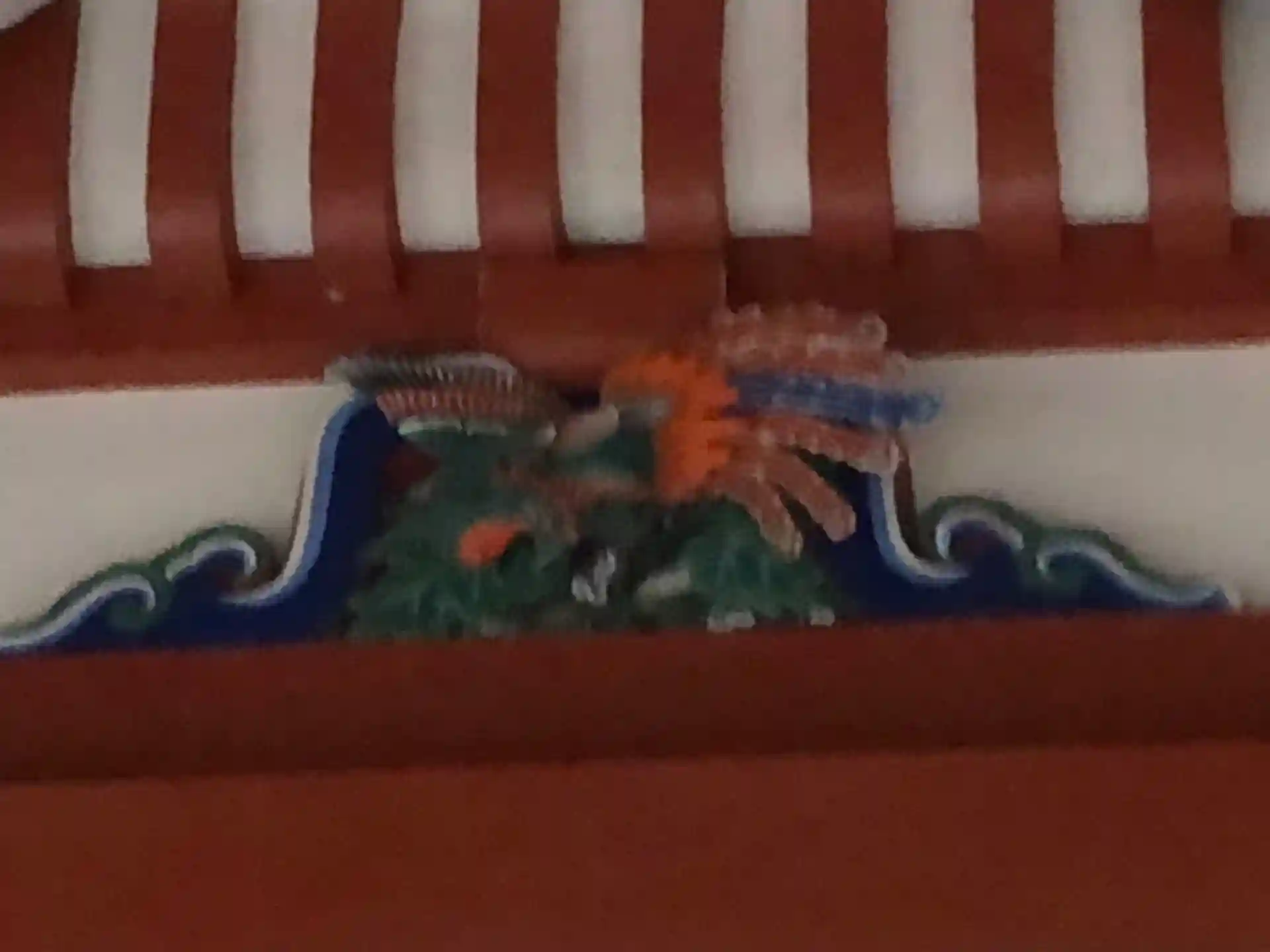 不思議な鏡。手前の模様が鏡に映ると模様が変化します。