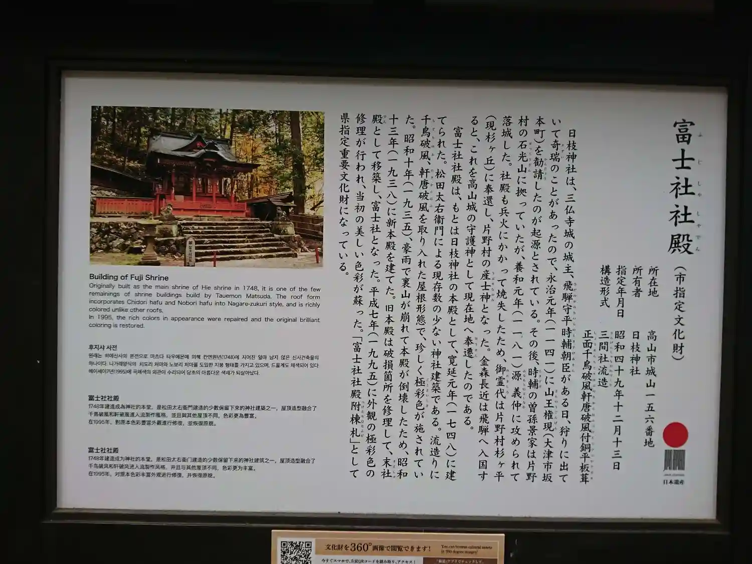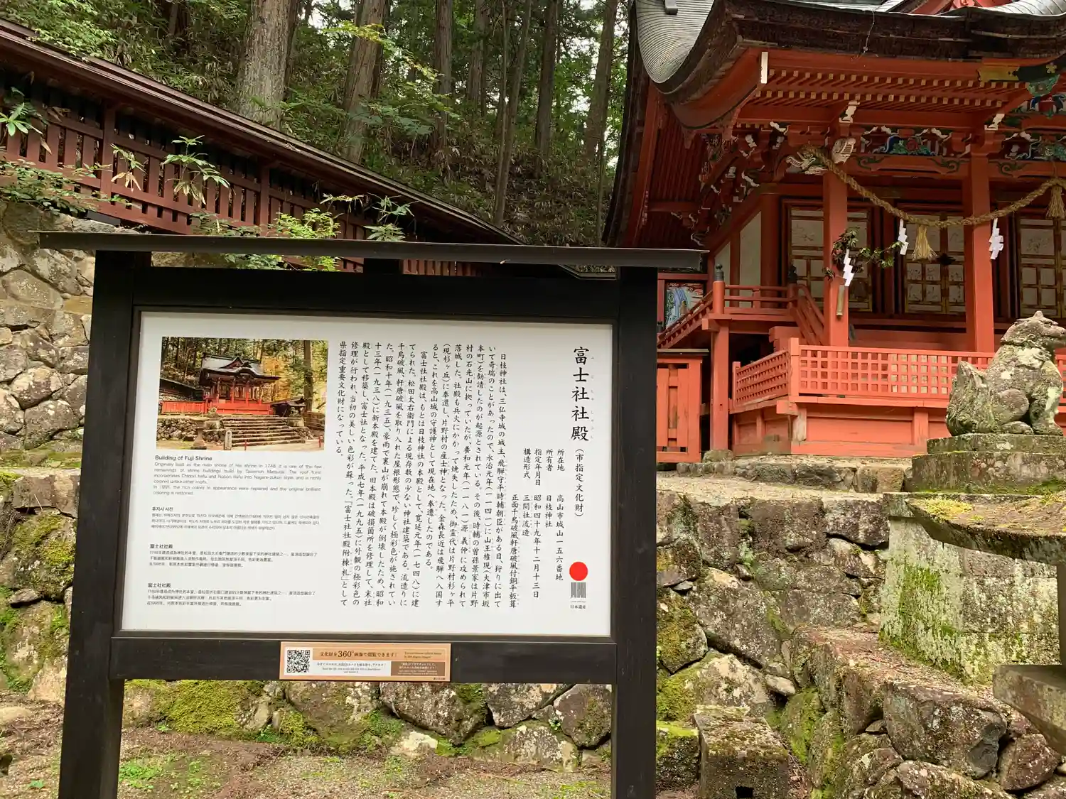 | ご由緒 | 遠く永治元年(1141)、時の飛騨守時輔朝臣が、ある日片野山中で狩りに出て、奇瑞のことがあったので、その城をかまえていた石光山(今の高山市片野地内)に近江の日吉大神を勧請して、城の鎮護としたのがはじまりである。その後、四代目景家の時、養和元年(1181)正月、源義仲の部将手塚光盛に攻められ、利あらずして敗亡、社殿も兵火にかかって消失したが、幸いにして御霊体は災禍をまぬがれ無事奉安することができ、里人によって社殿は再興され、片野村の産土神として奉祀されていた。(今、この地を「元山王」とよんでいる。)幾多の年月を経て天正13年(1585)、金森長近父子が豊臣秀吉の命によって飛騨へ入国、諸将を平らげて国内を統一し、国守に封ぜられて、同14年、城を天神山(今の城山)に築いた。金森氏の祖は近江国で、代々日枝大神の崇敬が厚かったことなどから、慶長10年(1605)、片野より現在の地へ奉遷して城の鎮護神とし、社地と社殿を寄進造営、社僧松樹院を置いて片野、高山南半分の産土神に定められた。かくして金森氏歴代100余年間、城主の崇敬あつく度々の社殿の改築修造が行われてきた。今に残る社殿の棟木、神輿等に見る国守の紋所梅鉢はじめ金森長近公愛用の陣羽織及び刀等にもそれを伺うことができる。元禄5年(1692)、城主移封となり、徳川幕府の直轄となってからも、歴代の代官・郡代の尊崇あつく、度々社殿の修築、参詣があった。明治以後は郷社を経て昭和に県社となり、一般に『山王さま』と親しまれ、氏子数2700戸はじめ高山市民の尊崇を集めている。 |